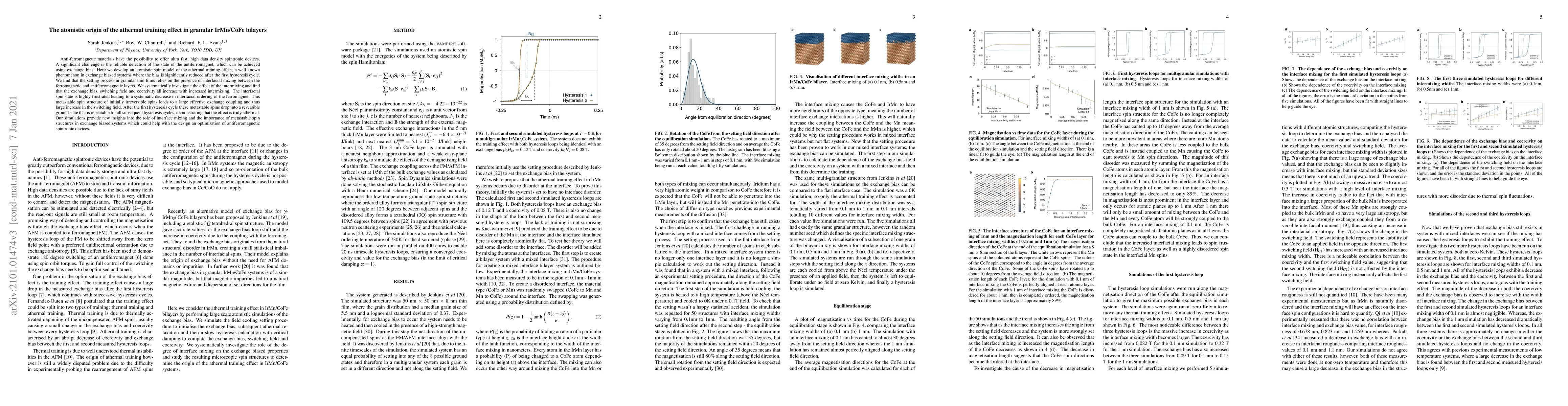 This research paper presents an atomistic spin model explaining the athermal training effect in exchange-biased granular IrMn/CoFe bilayers. The study finds that interfacial mixing between ferromagnetic and antiferromagnetic layers is crucial for the setting process, with exchange bias, switching field, and coercivity increasing with more intermixing. After the first hysteresis cycle, metastable spins transition to a reversible ground state, demonstrating the athermal nature of the effect. The findings offer insights into designing and optimizing antiferromagnetic spintronic devices.