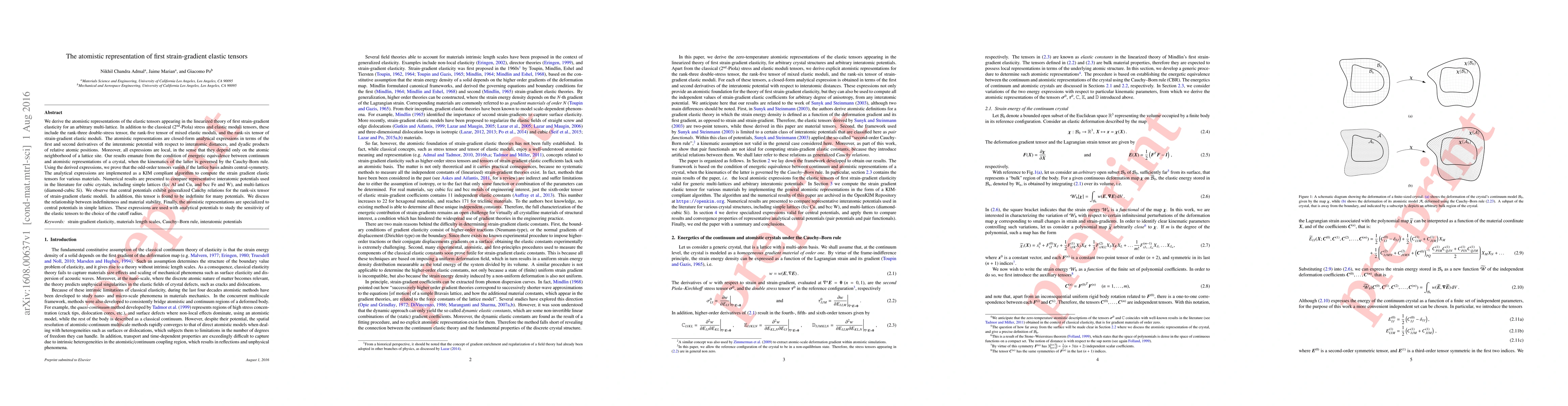 We derive the atomistic representations of the elastic tensors appearing in the linearized theory of first strain-gradient elasticity for an arbitrary multi-lattice. In addition to the classical (2nd-Piola) stress and elastic moduli tensors, these include the rank-three double-stress tensor, the rank-five tensor of mixed elastic moduli, and the rank-six tensor of strain-gradient elastic moduli. The atomistic representations are closed-form analytical expressions in terms of the first and second derivatives of the interatomic potential with respect to interatomic distances, and dyadic products of relative atomic positions. Moreover, all expressions are local, in the sense that they depend only on the atomic neighborhood of a lattice site. Our results emanate from the condition of energetic equivalence between continuum and atomistic representations of a crystal, when the kinematics of the latter is governed by the Cauchy-Born rule. Using the derived expressions, we prove that the odd-order tensors vanish if the lattice basis admits central-symmetry. The analytical expressions are implemented as a KIM compliant algorithm to compute the strain gradient elastic tensors for various materials. Numerical results are presented to compare representative interatomic potentials used in the literature for cubic crystals, including simple lattices and multi-lattices. We observe that central potentials exhibit generalized Cauchy relations for the rank-six tensor of strain-gradient elastic moduli. In addition, this tensor is found to be indefinite for many potentials. We discuss the relationship between indefiniteness and material stability. Finally, the atomistic representations are specialized to central potentials in simple lattices. These expressions are used with analytical potentials to study the sensitivity of the elastic tensors to the choice of the cutoff radius.