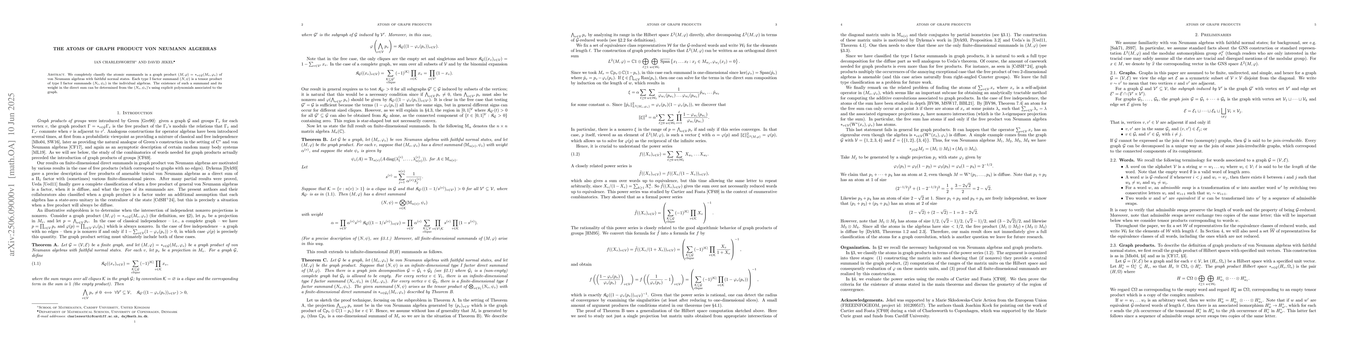 This research paper provides a complete classification of atomic summands in a graph product of von Neumann algebras, determining the existence and weight of type I factor summands using polynomials associated with the graph, based on individual algebra summands.