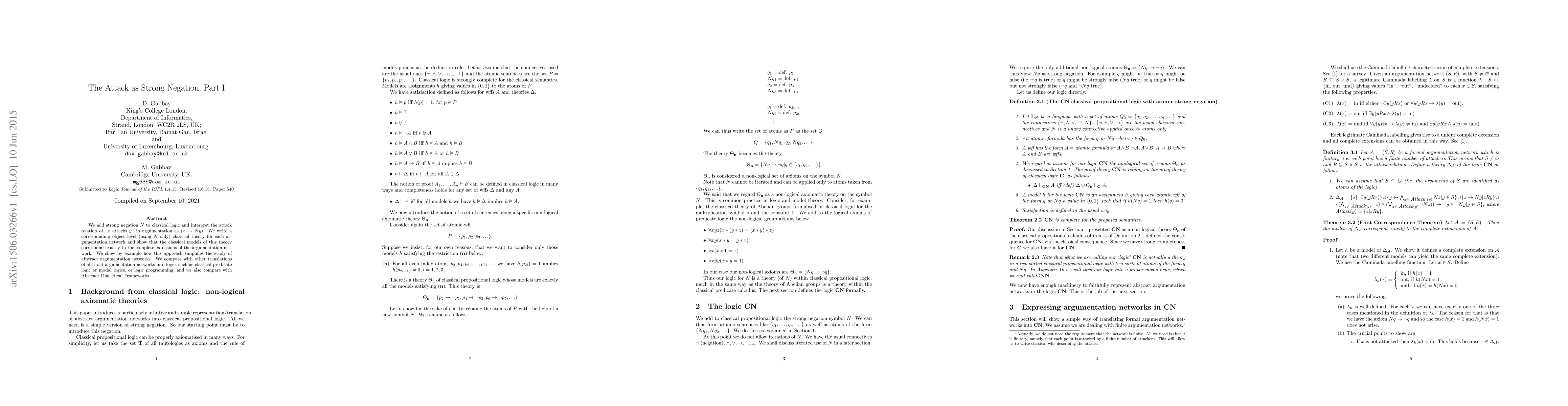 We add strong negation $N$ to classical logic and interpret the attack relation of "$x$ attacks $y$" in argumentation as $(x\to Ny)$. We write a corresponding object level (using $N$ only) classical theory for each argumentation network and show that the classical models of this theory correspond exactly to the complete extensions of the argumentation network. We show by example how this approach simplifies the study of abstract argumentation networks. We compare with other translations of abstract argumentation networks into logic, such as classical predicate logic or modal logics, or logic programming, and we also compare with Abstract Dialectical Frameworks.