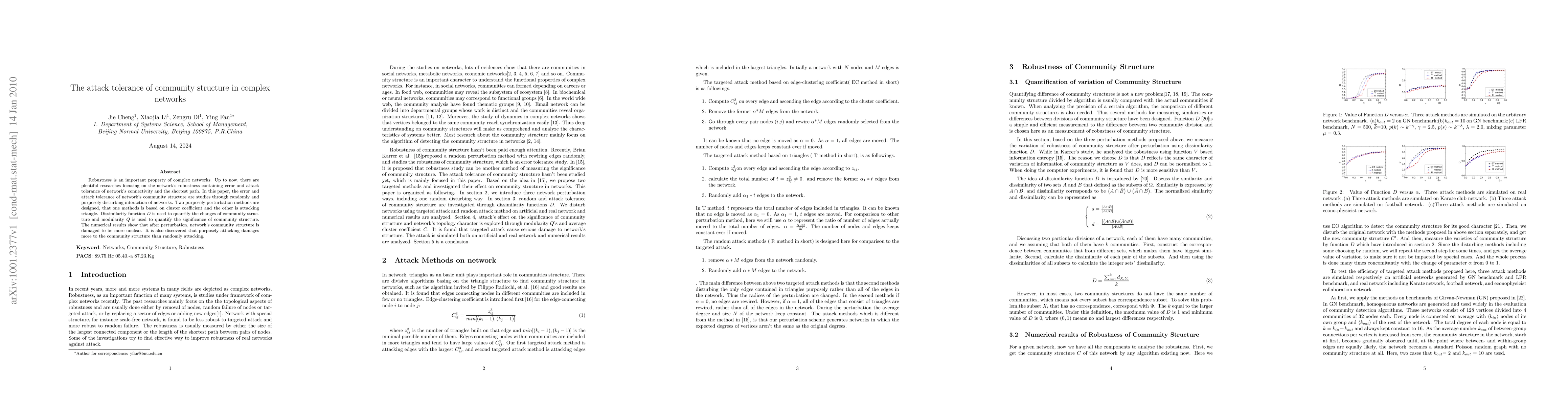 This paper investigates the attack tolerance of community structure in complex networks, employing both random and targeted perturbations. It finds that targeted attacks, particularly those based on cluster coefficients and triangle attacks, significantly degrade community structure clarity compared to random disturbances.