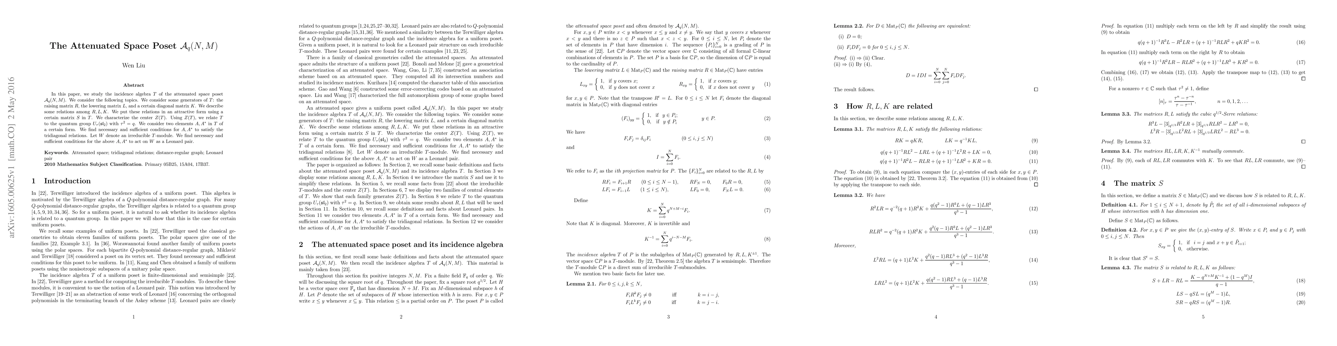 In this paper, we study the incidence algebra $T$ of the attenuated space poset $\mathcal{A}_q(N, M)$. We consider the following topics. We consider some generators of $T$: the raising matrix $R$, the lowering matrix $L$, and a certain diagonal matrix $K$. We describe some relations among $R, L, K$. We put these relations in an attractive form using a certain matrix $S$ in $T$. We characterize the center $Z(T)$. Using $Z(T)$, we relate $T$ to the quantum group $U_\tau({\mathfrak{sl}}_2)$ with $\tau^2=q$. We consider two elements $A, A^*$ in $T$ of a certain form. We find necessary and sufficient conditions for $A, A^*$ to satisfy the tridiagonal relations. Let $W$ denote an irreducible $T$-module. We find necessary and sufficient conditions for the above $A, A^*$ to act on $W$ as a Leonard pair.