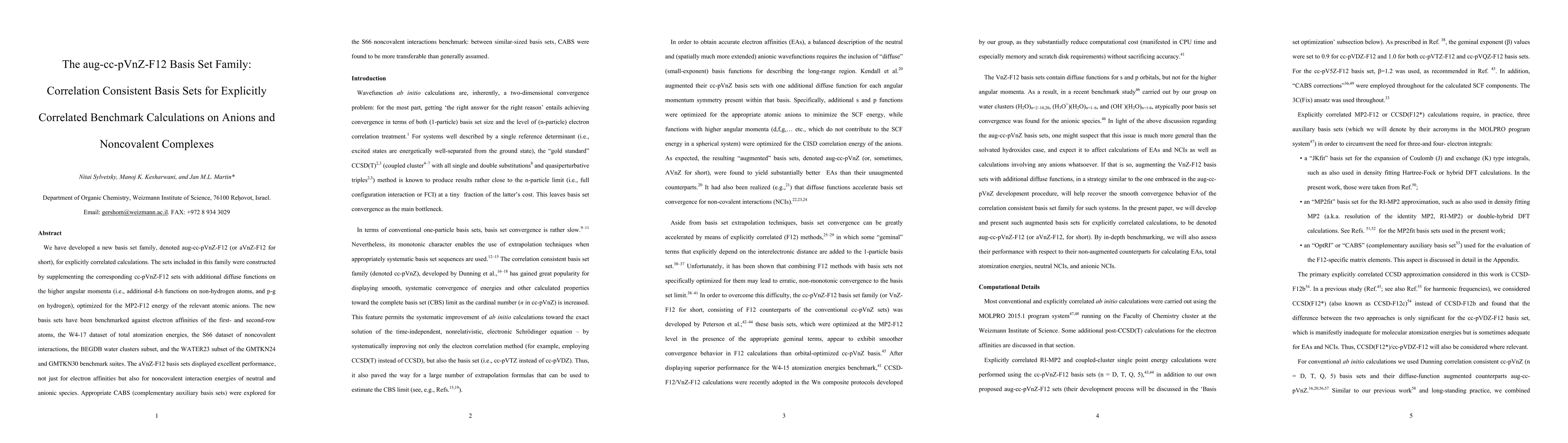 The aug-cc-pVnZ-F12 basis set family is designed for explicitly correlated calculations, optimized for MP2-F12 energy of atomic anions, and benchmarked against various datasets for electron affinities and noncovalent interactions, showing excellent performance. Complementary auxiliary basis sets (CABS) were found to be more transferable than previously assumed for noncovalent interactions.