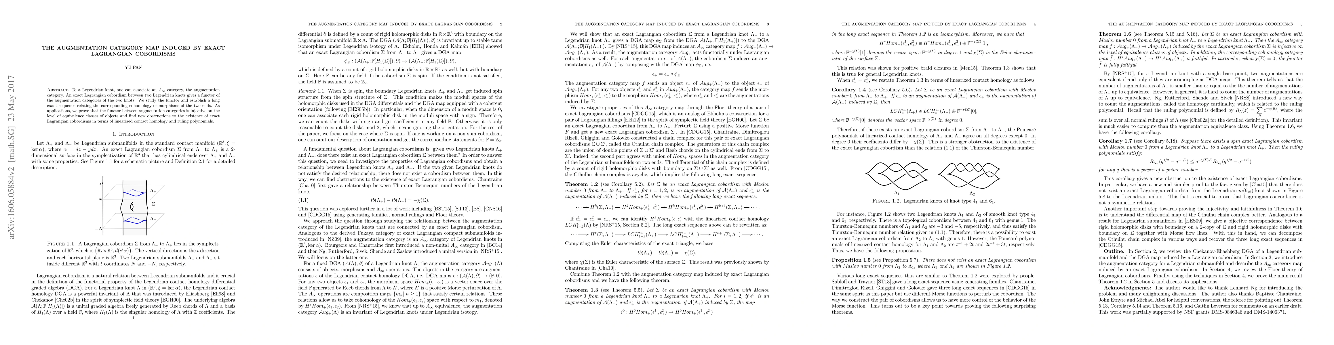 To a Legendrian knot, one can associate an $\mathcal{A}_{\infty}$ category, the augmentation category. An exact Lagrangian cobordism between two Legendrian knots gives a functor of the augmentation categories of the two knots. We study the functor and establish a long exact sequence relating the corresponding cohomology of morphisms of the two ends. As applications, we prove that the functor between augmentation categories is injective on the level of equivalence classes of objects and find new obstructions to the existence of exact Lagrangian cobordisms in terms of linearized contact homology and ruling polynomials.