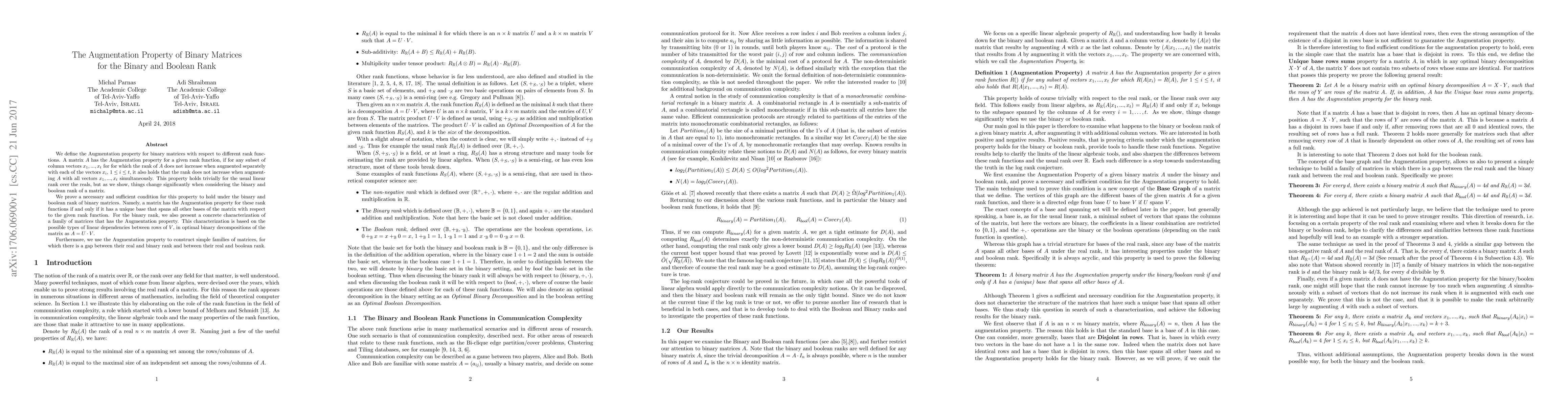 This paper defines the Augmentation property for binary matrices concerning binary and boolean rank, proving that it holds if and only if the matrix has a unique base spanning all other bases. It also characterizes a family of matrices with this property based on linear dependencies in optimal binary decompositions and uses it to show rank gaps between real and binary/boolean ranks.