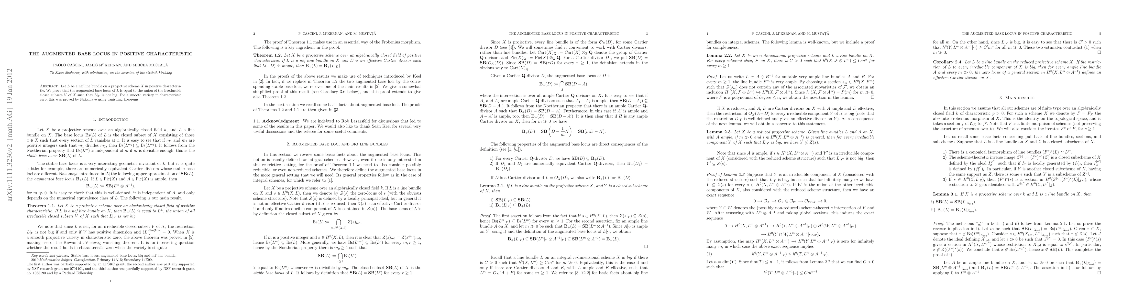Summary: The paper proves that for a nef line bundle L on a projective scheme in positive characteristic, the augmented base locus is the union of irreducible closed subsets where L fails to be big. This extends a result previously established by Nakamaye for smooth varieties in characteristic zero using vanishing theorems.