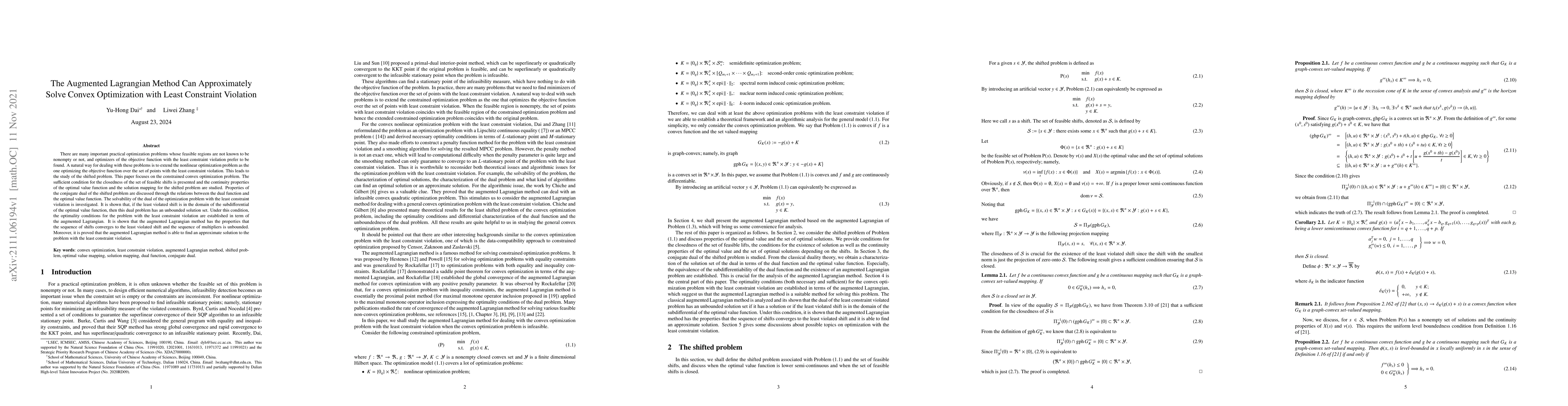 There are many important practical optimization problems whose feasible regions are not known to be nonempty or not, and optimizers of the objective function with the least constraint violation prefer to be found. A natural way for dealing with these problems is to extend the nonlinear optimization problem as the one optimizing the objective function over the set of points with the least constraint violation. This leads to the study of the shifted problem. This paper focuses on the constrained convex optimization problem. The sufficient condition for the closedness of the set of feasible shifts is presented and the continuity properties of the optimal value function and the solution mapping for the shifted problem are studied. Properties of the conjugate dual of the shifted problem are discussed through the relations between the dual function and the optimal value function. The solvability of the dual of the optimization problem with the least constraint violation is investigated. It is shown that, if the least violated shift is in the domain of the subdifferential of the optimal value function, then this dual problem has an unbounded solution set. Under this condition, the optimality conditions for the problem with the least constraint violation are established in term of the augmented Lagrangian. It is shown that the augmented Lagrangian method has the properties that the sequence of shifts converges to the least violated shift and the sequence of multipliers is unbounded. Moreover, it is proved that the augmented Lagrangian method is able to find an approximate solution to the problem with the least constraint violation.