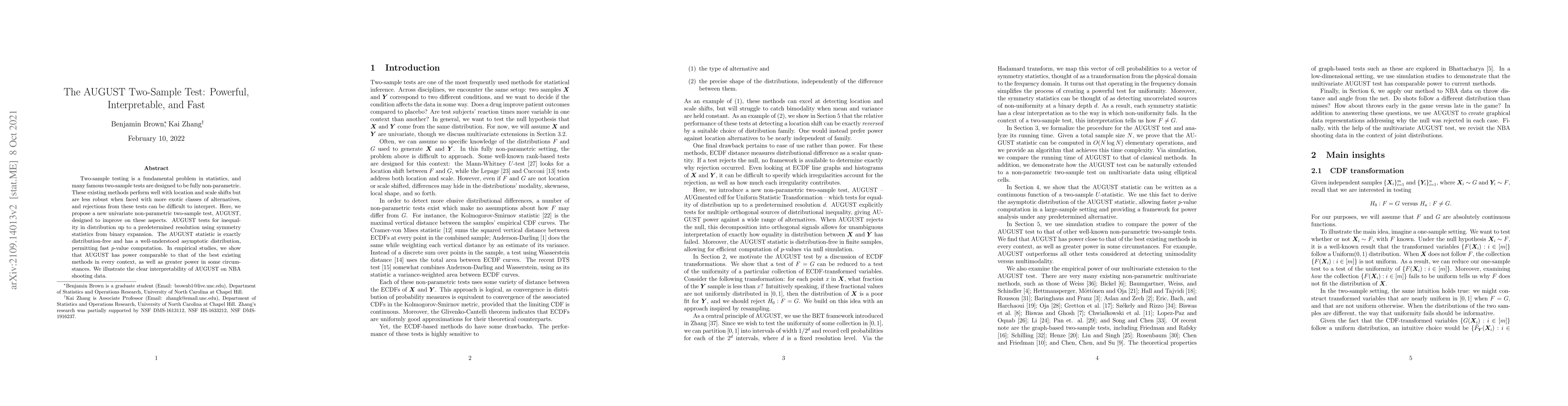 AUGUST is a new univariate non-parametric two-sample test that offers comparable power to existing methods with greater interpretability, using symmetry statistics from binary expansion to detect distributional inequality.