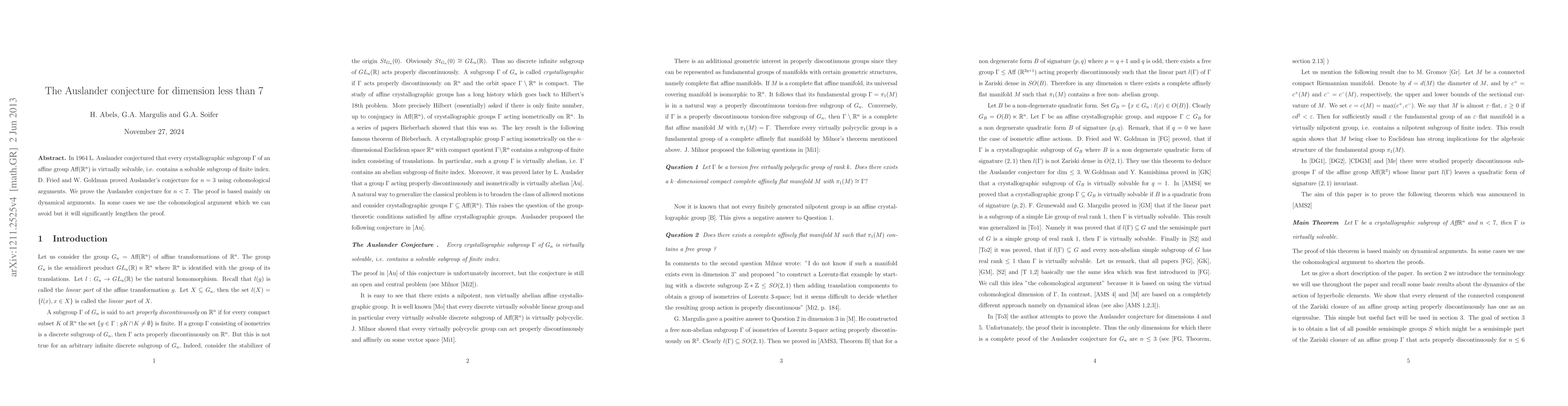 In 1967 L. Auslander conjectured that every crystallographic subgroup of an affine group is virtually solvable, i.e. contains a solvable subgroup of finite index. D. Fried and W. Goldman proved Auslander's conjecture for affine space of dimension 3 using cohomological arguments. Using dynamical arguments we prove the Auslander conjecture for dimension less than 7.
