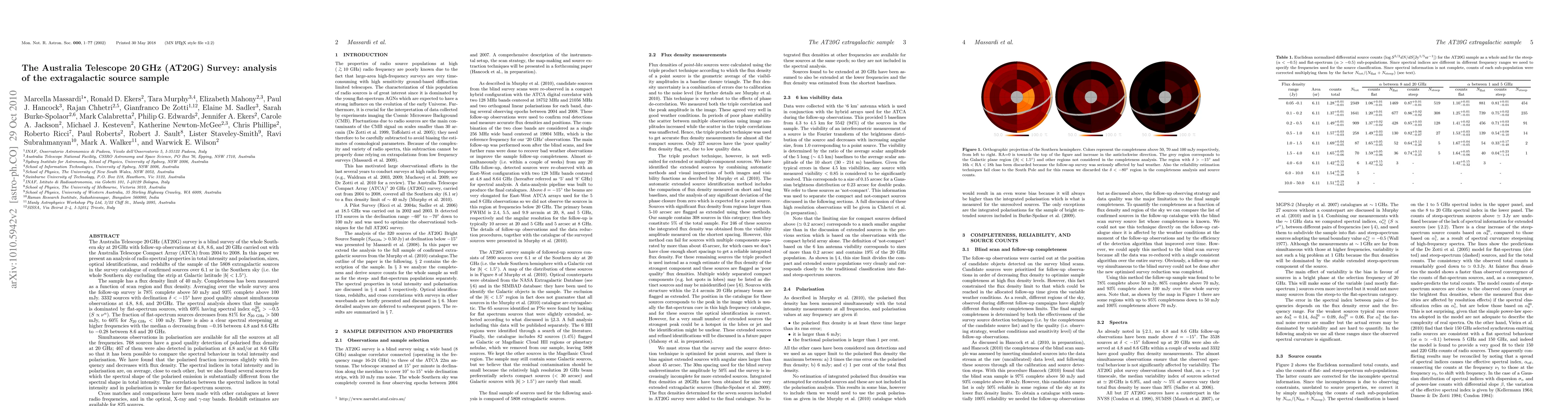 The AT20G survey catalogues 5808 extragalactic sources in the Southern sky, with a focus on radio spectral properties and polarisation. The sample is dominated by flat-spectrum sources, with a decreasing fraction at lower flux densities, and shows a clear spectral steepening at higher frequencies.