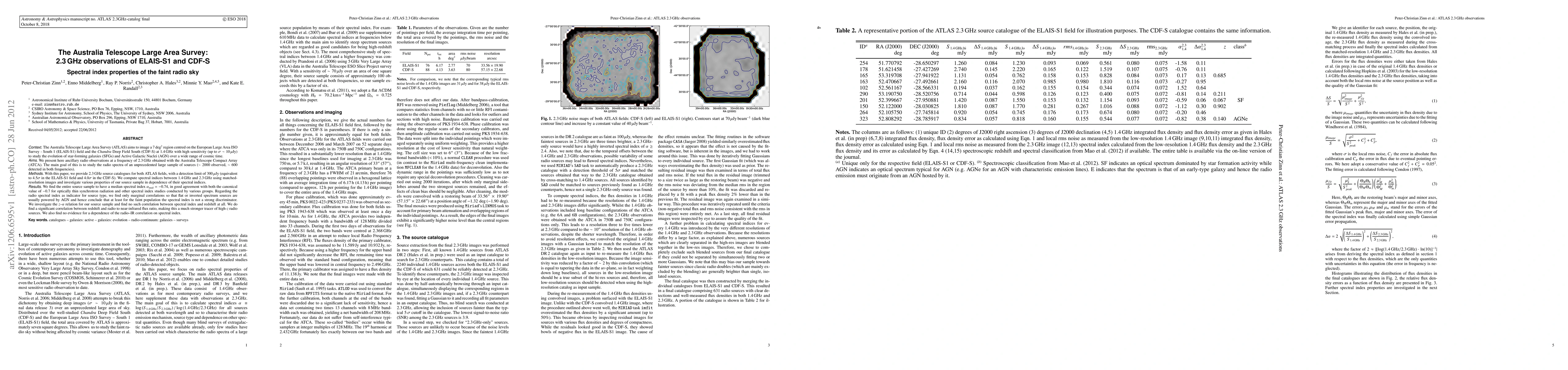 Context. The Australia Telescope Large Area Survey (ATLAS) aims to image a 7 deg2 region centred on the European Large Area ISO Survey - South 1 (ELAIS-S1) field and the Chandra Deep Field South (CDF-S) at 1.4 GHz with high sensitivity (up to ~10 \muJy) to study the evolution of star-forming galaxies (SFGs) and Active Galactic Nuclei (AGN) over a wide range of cosmic time. Aims. We present here ancillary radio observations at a frequency of 2.3 GHz obtained with the Australia Telescope Compact Array (ATCA). The main goal of this is to study the radio spectra of an unprecedented large sample of sources (~2000 observed, ~600 detected in both frequencies). Methods. With this paper, we provide 2.3 GHz source catalogues for both ATLAS fields, with a detection limit of 300 \muJy. We compute spectral indices between 1.4 GHz and 2.3 GHz using matched resolution images and investigate various properties of our source sample in dependence of their spectral indices. Results. We find the entire source sample to have a median spectral index of 0.74, in good agreement with both the canonical value of 0.7 for optically thin synchrotron radiation and other spectral index studies conducted by various groups. Regarding the radio spectral index as indicator for source type, we find only marginal correlations so that flat or inverted spectrum sources are usually powered by AGN and hence conclude that at least for the faint population the spectral index is not a strong discriminator. We investigate relation between spectral index and redshift for our source sample and find no such correlation at all. We do find a significant correlation between redshift and radio to near-infrared flux ratio, making this a much stronger tracer of high-z radio sources. We also find no evidence for a dependence of the radio-IR correlation on spectral index.