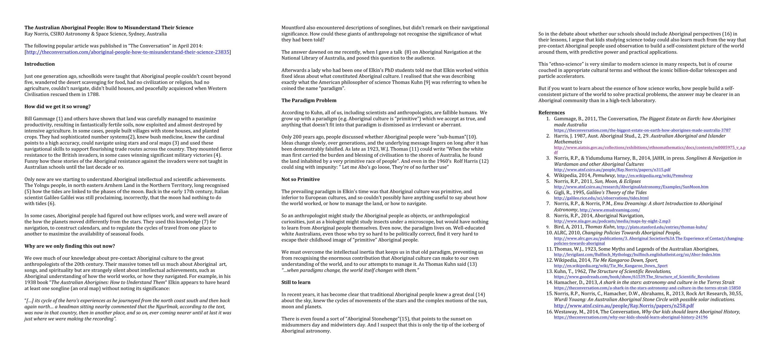 Just one generation ago, schoolkids were taught that Aboriginal people couldn't count beyond five, wandered the desert scavenging for food, had no civilization or religion, had no agriculture, couldn't navigate, didn't build houses, and peacefully acquiesced when Western Civilisation rescued them in 1788. How did we get it so wrong? Here I show that traditional Aboriginal people knew a great deal about the sky, knew the cycles of movements of the stars and the complex motions of the sun, moon and planets. I argue that school students studying science today could learn much from the way that pre-contact Aboriginal people used observation to build a self-consistent picture of the world around them, with predictive power and practical applications.
