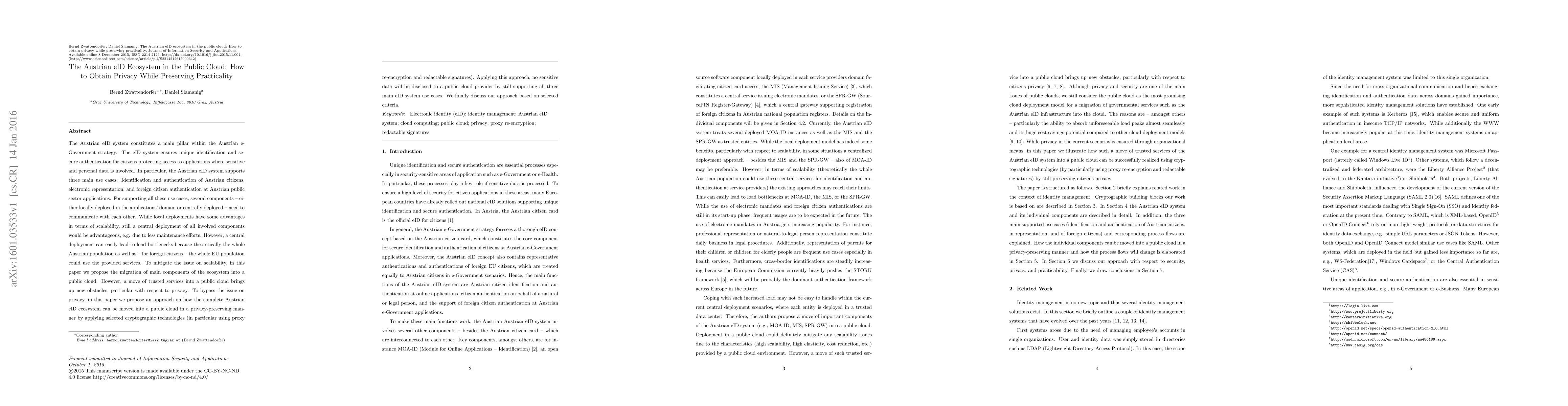 This paper proposes migrating the Austrian eID ecosystem's main components to a public cloud for scalability, while preserving privacy using cryptographic technologies like proxy re-encryption and redactable signatures. This ensures no sensitive data is disclosed to the cloud provider, maintaining all eID system use cases.