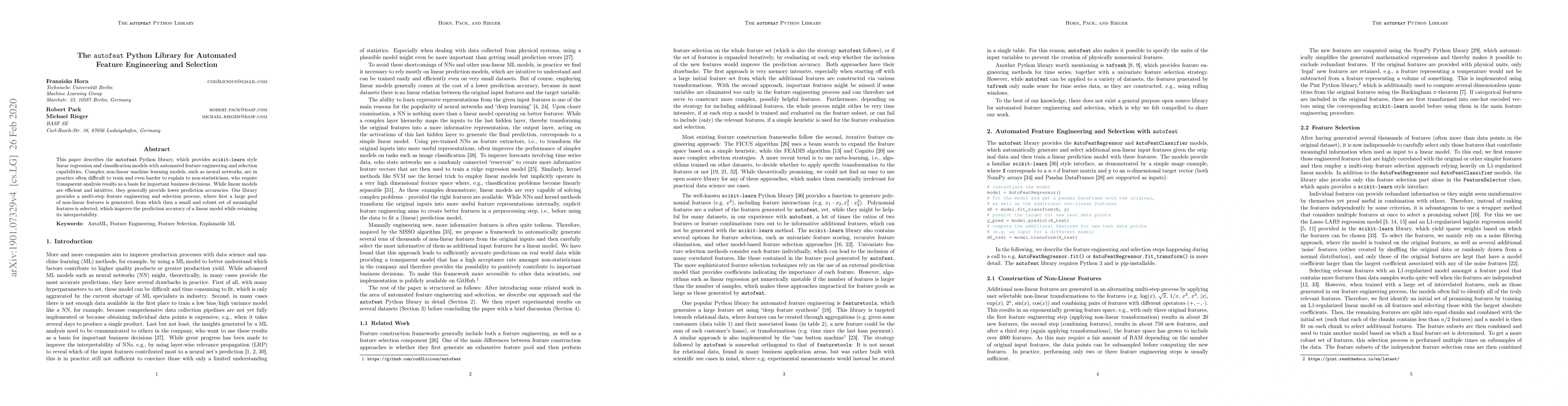 The autofeat Python library automates feature engineering and selection for scikit-learn linear models, generating non-linear features and selecting a robust set to enhance prediction accuracy while maintaining model interpretability. This approach aims to bridge the gap between complex, non-intuitive models and simpler, more transparent linear models.