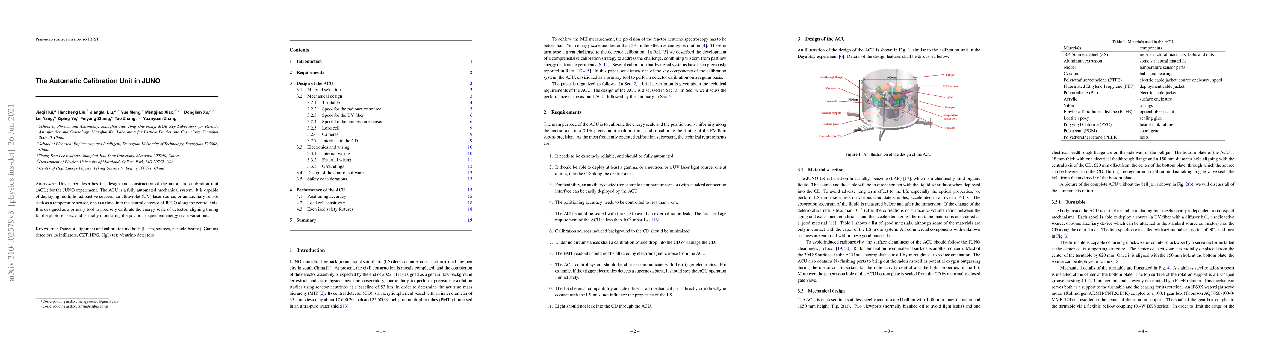 The paper details the design and construction of the automatic calibration unit (ACU) for the JUNO experiment, a fully automated mechanical system that deploys various sources for precise calibration of the detector's energy scale, timing alignment of photosensors, and monitoring of position-dependent energy variations.