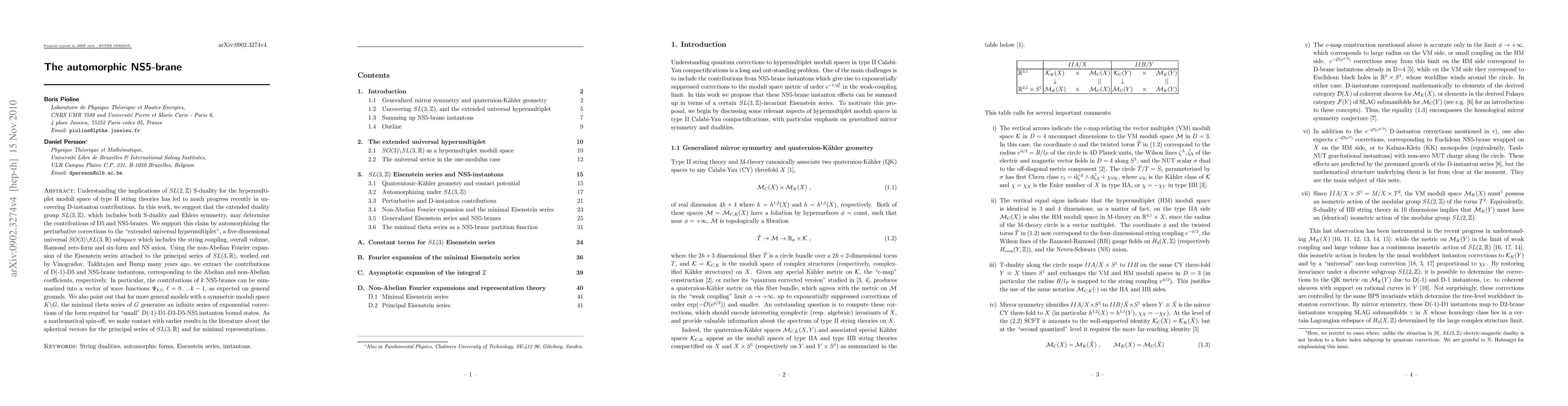 The paper's technical contribution lies in the automorphicization of perturbative corrections to the universal hypermultiplet using the non-Abelian Fourier expansion of Eisenstein series, and in identifying the contributions of D5 and NS5-branes through SL(3,Z) duality.