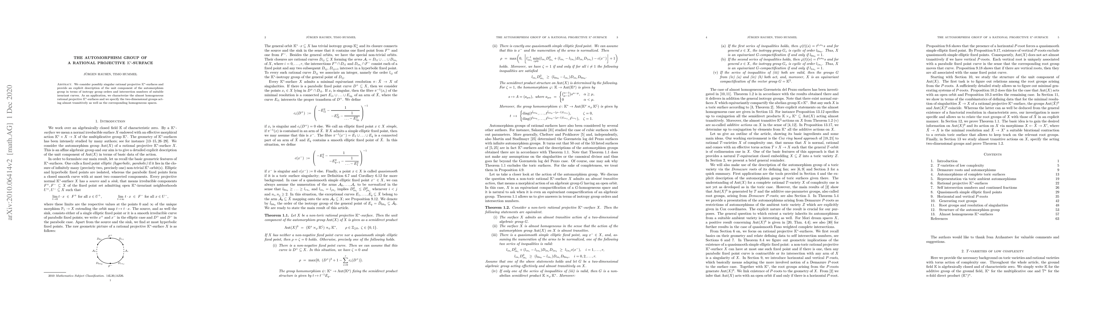 We consider possibly singular rational projective k*-surfaces and provide an explicit description of the unit component of the automorphism group in terms of isotropy group orders and intersection numbers of suitable invariant curves. As an application, we characterize the almost homogeneous rational projective k*-surfaces and we specify the two-dimensional groups acting almost transitively as well as the corresponding homogeneous spaces.