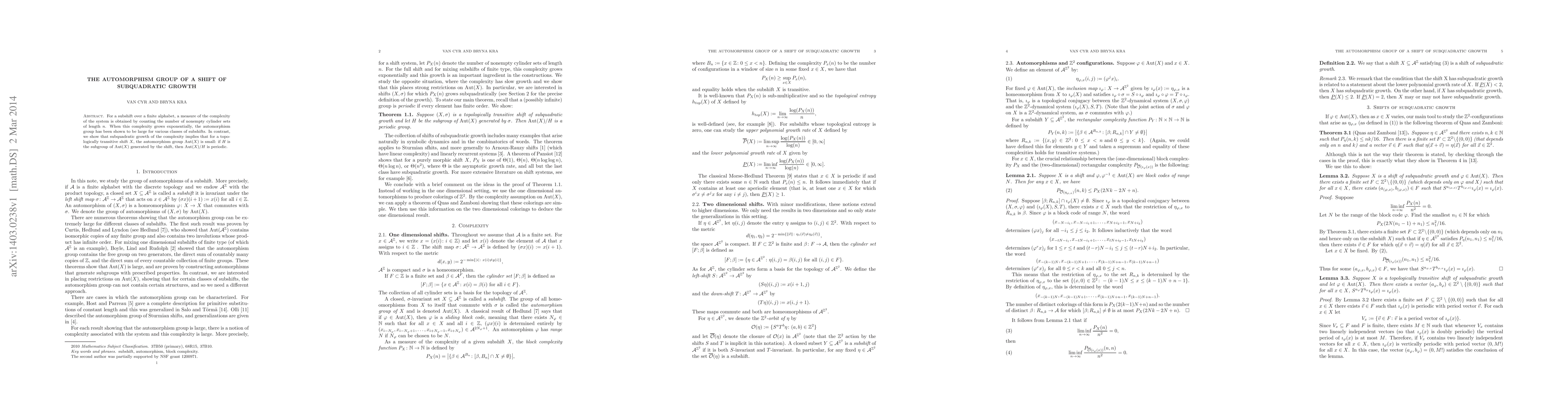 This paper demonstrates that for topologically transitive shifts with subquadratic growth complexity, the automorphism group $\Aut(X)$ is small relative to the subgroup $H$ generated by the shift, with $\Aut(X)/H$ being a periodic group.