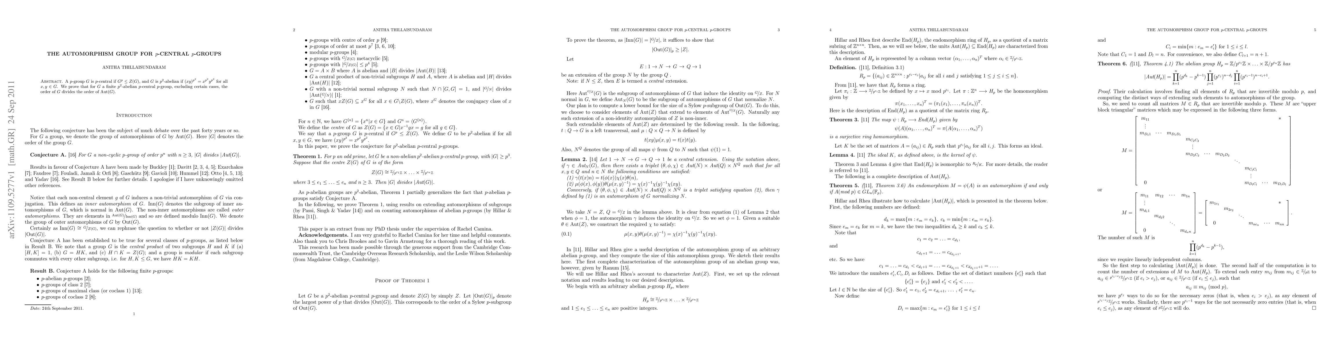 Summary: This paper proves that for a specific subset of finite p-central p-groups, the order of the group divides the order of its automorphism group. The focus is on the structural properties of these groups and their automorphisms.