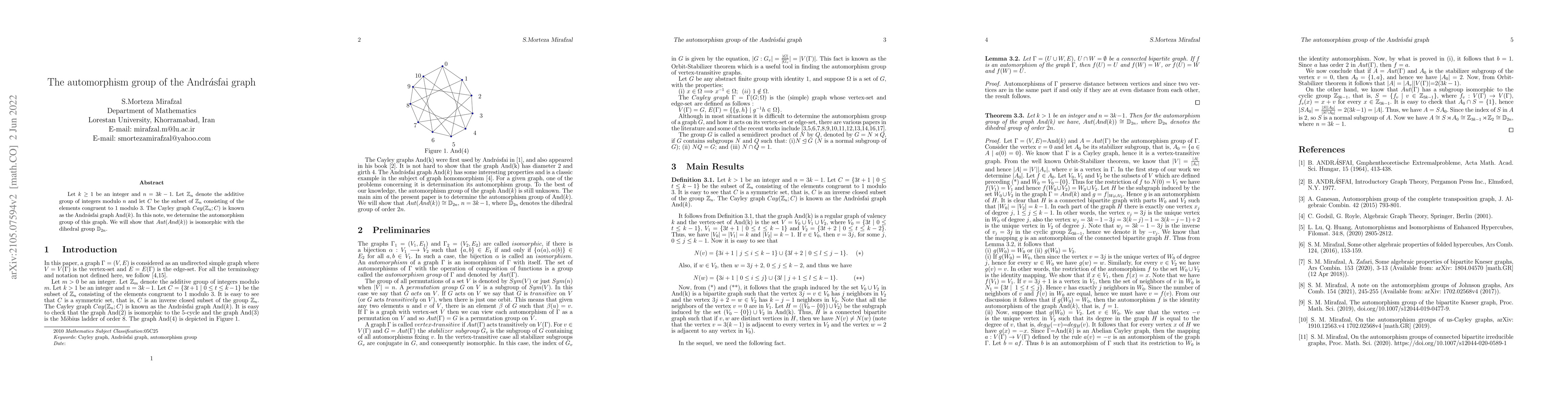 The paper presents a detailed proof of the isomorphism between the automorphism group of the Andrásfai graph and the dihedral group D2n, employing concepts from group theory and graph theory.
