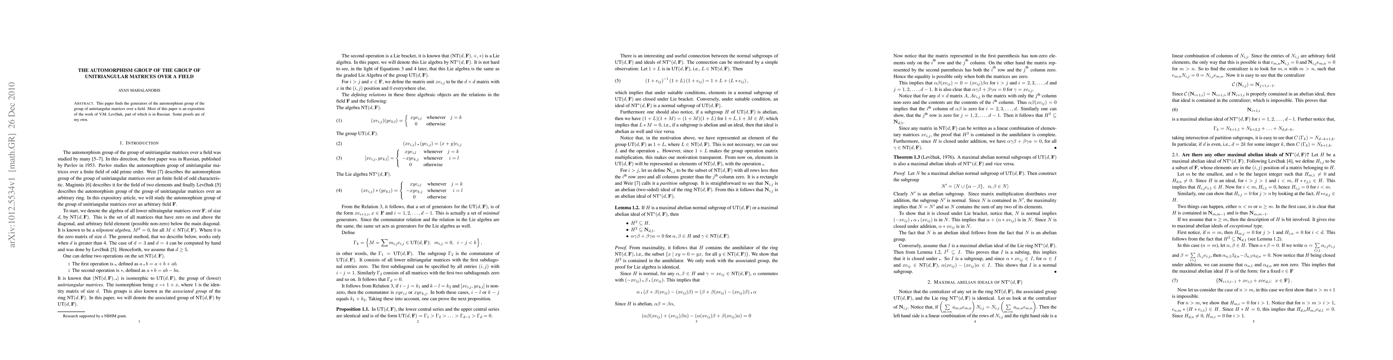This paper finds the generators of the automorphism group of the group of unitriangular matrices over a field. Most of this paper is an exposition of the work of V.M. Lev\u{c}huk, part of which is in Russian. Some proofs are of my own.