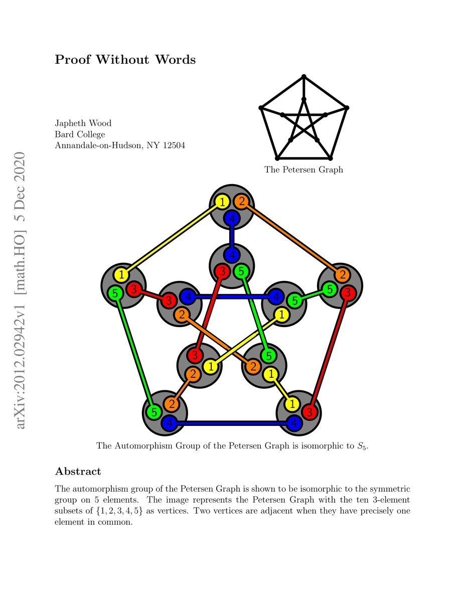 The automorphism group of the Petersen Graph is shown to be isomorphic to the symmetric group on 5 elements. The image represents the Petersen Graph with the ten 3-element subsets of $\{1, 2, 3, 4, 5\}$ as vertices. Two vertices are adjacent when they have precisely one element in common.