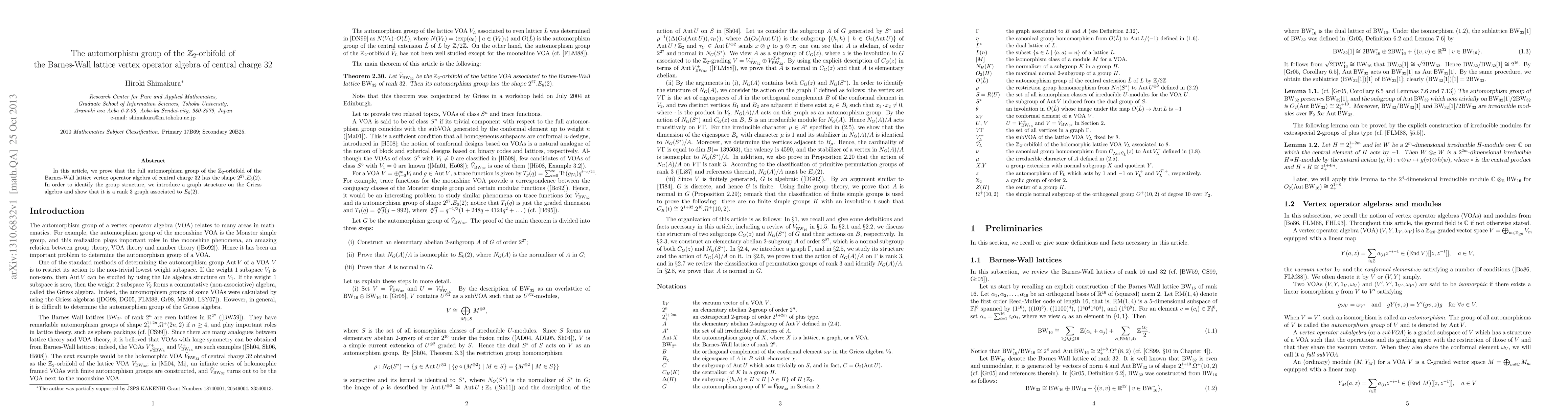 In this article, we prove that the full automorphism group of the Z_2-orbifold of the Barnes-Wall lattice vertex operator algebra of central charge 32 has the shape $2^{27}.E_6(2)$. In order to identify the group structure, we introduce a graph structure on the Griess algebra and show that it is a rank 3 graph associated to $E_6(2)$.