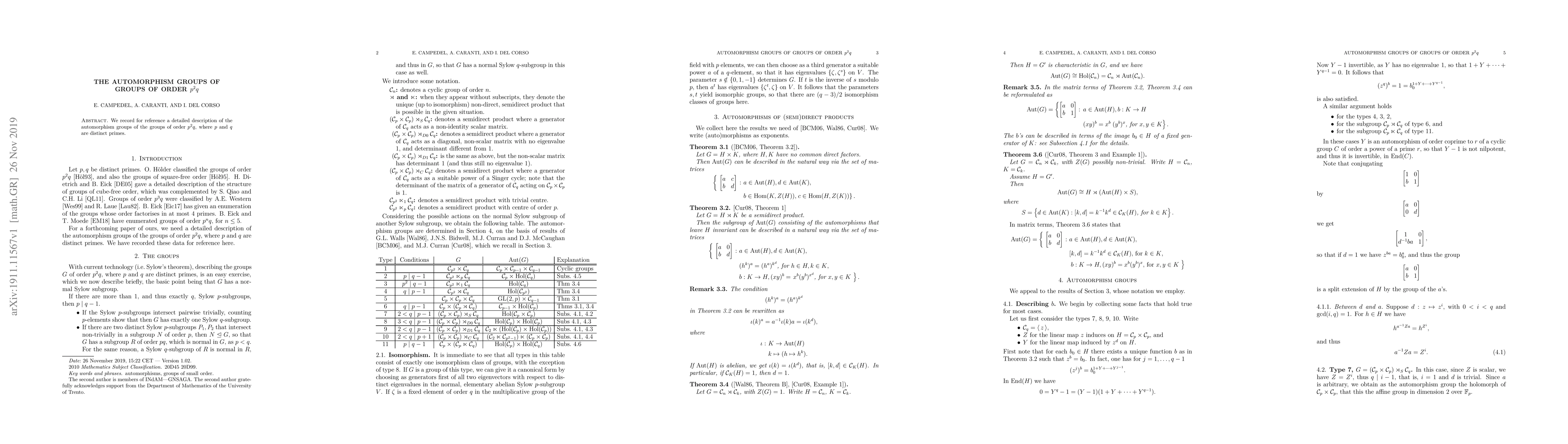This paper provides a comprehensive description of the automorphism groups for groups of order \( p^2 q \), where \( p \) and \( q \) are distinct primes, offering valuable reference information for researchers in the field of group theory.