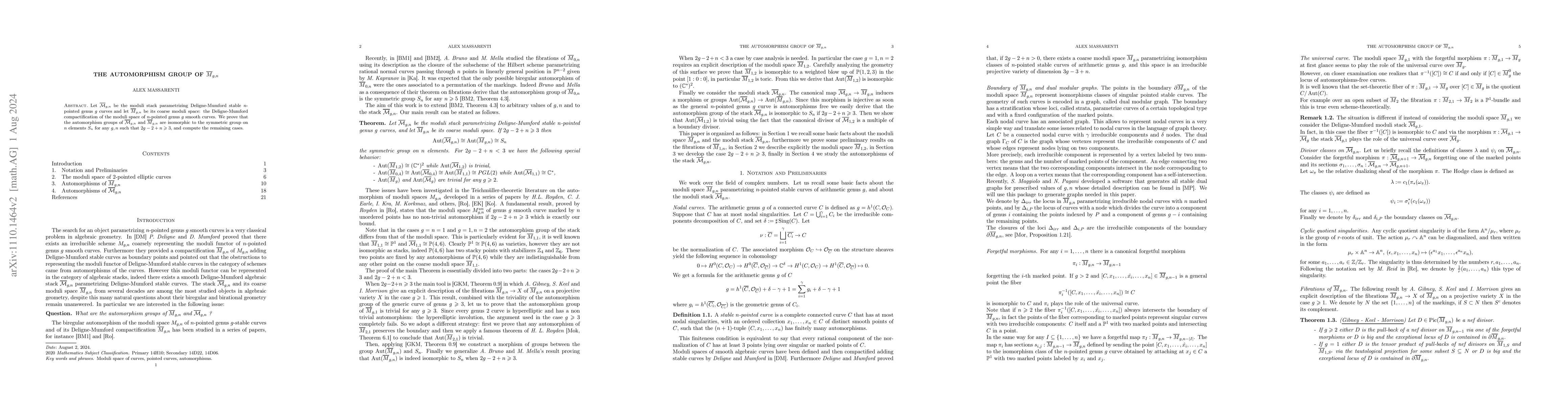 This paper proves that the automorphism groups of the moduli stack and space for Deligne-Mumford stable n-pointed genus g curves are isomorphic to the symmetric group \( S_n \), provided \( 2g-2+n \geq 3 \). It also computes these groups for cases where the inequality does not hold.