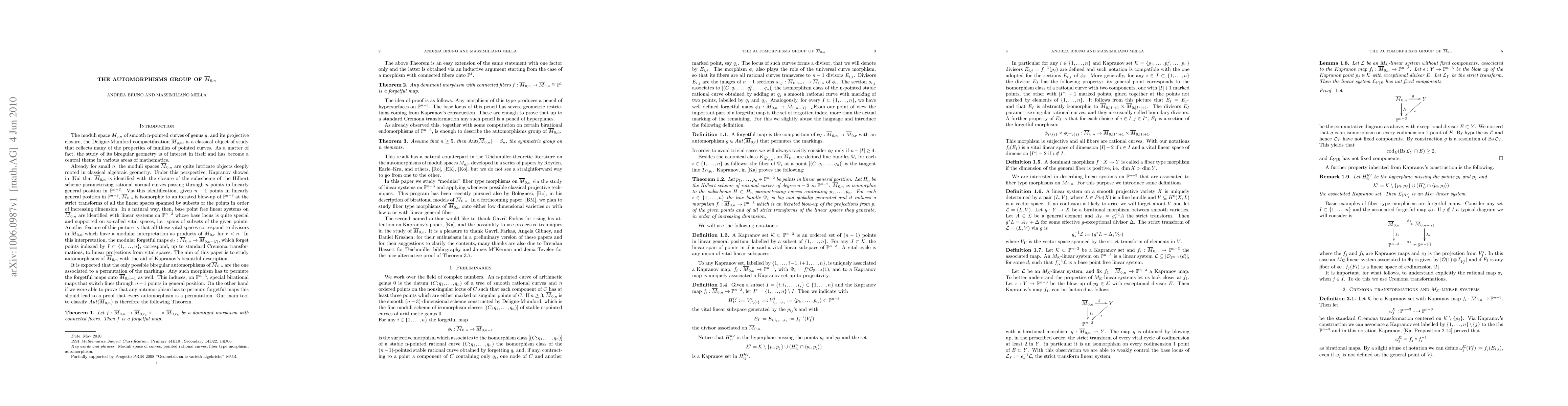 This paper demonstrates that fiber type morphisms between moduli spaces of pointed rational curves are exclusively forgetful maps, thereby proving that the automorphism group of $\overline{M}_{0,n}$ is the permutation group on $n$ elements for $n \geq 5$.