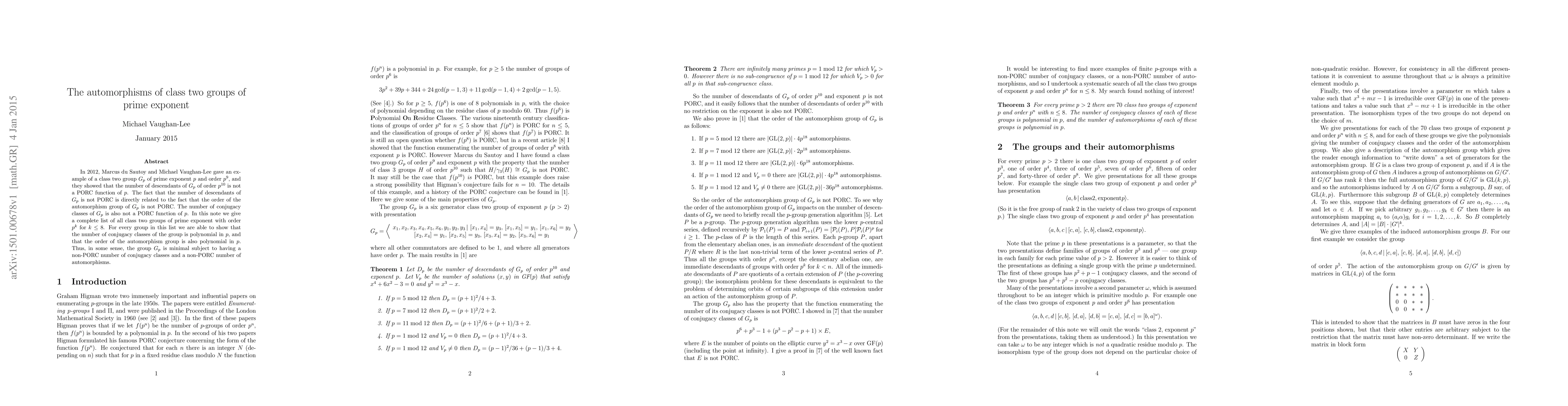 This paper provides a complete enumeration of all 70 class two groups of prime exponent p (p>2) with orders up to p^8, detailing the number of conjugacy classes and the order of their automorphism groups as polynomials in p. It contrasts these findings with a known example of a class two group of order p^9 where neither the number of conjugacy classes nor the automorphism group order is polynomial on residue classes.