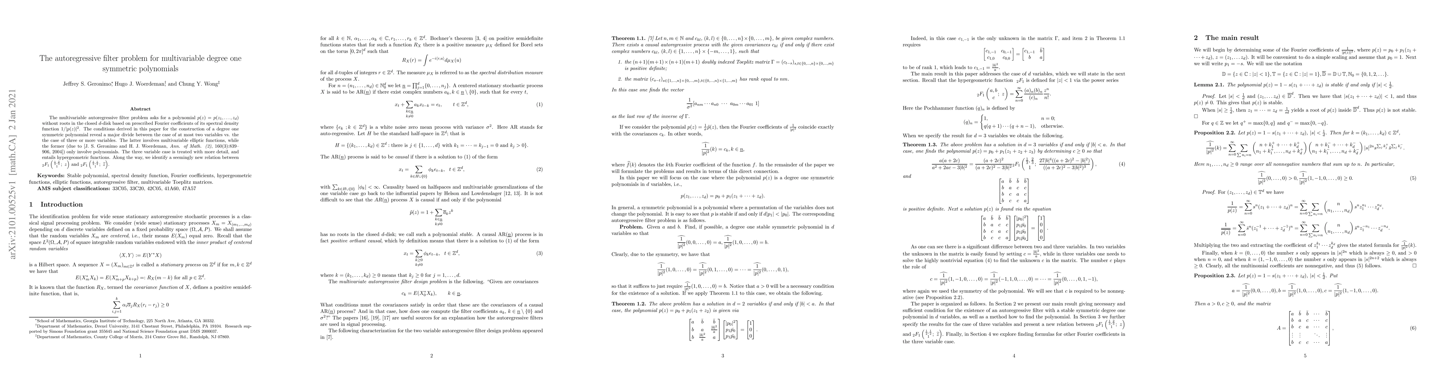 The multivariable autoregressive filter problem asks for a polynomial $p(z)=p(z_1, \ldots , z_d)$ without roots in the closed $d$-disk based on prescribed Fourier coefficients of its spectral density function $1/|p(z)|^2$. The conditions derived in this paper for the construction of a degree one symmetric polynomial reveal a major divide between the case of at most two variables vs. the the case of three or more variables. The latter involves multivariable elliptic functions, while the former (due to [J. S. Geronimo and H. J. Woerdeman, Ann. of Math. (2), 160(3):839--906, 2004]) only involve polynomials. The three variable case is treated with more detail, and entails hypergeometric functions. Along the way, we identify a seemingly new relation between $_2F_1(\frac13,\frac23;1;z)$ and $_2F_1(\frac12,\frac12;1;\widetilde{z})$.