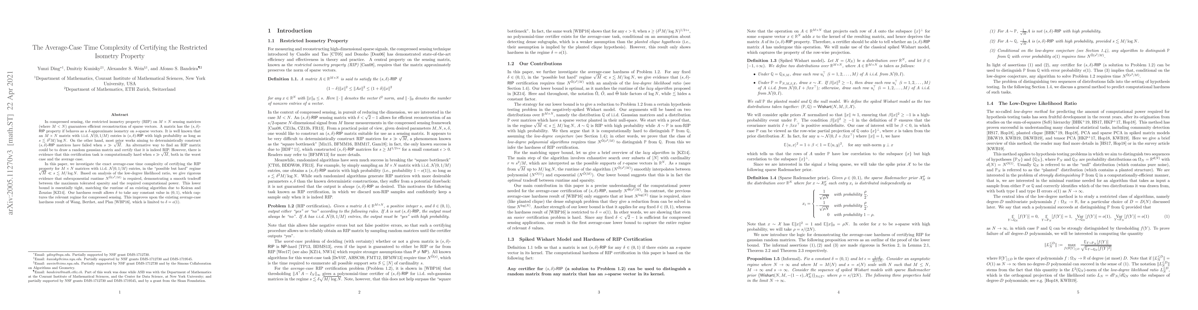 In compressed sensing, the restricted isometry property (RIP) on $M \times N$ sensing matrices (where $M < N$) guarantees efficient reconstruction of sparse vectors. A matrix has the $(s,\delta)$-$\mathsf{RIP}$ property if behaves as a $\delta$-approximate isometry on $s$-sparse vectors. It is well known that an $M\times N$ matrix with i.i.d. $\mathcal{N}(0,1/M)$ entries is $(s,\delta)$-$\mathsf{RIP}$ with high probability as long as $s\lesssim \delta^2 M/\log N$. On the other hand, most prior works aiming to deterministically construct $(s,\delta)$-$\mathsf{RIP}$ matrices have failed when $s \gg \sqrt{M}$. An alternative way to find an RIP matrix could be to draw a random gaussian matrix and certify that it is indeed RIP. However, there is evidence that this certification task is computationally hard when $s \gg \sqrt{M}$, both in the worst case and the average case. In this paper, we investigate the exact average-case time complexity of certifying the RIP property for $M\times N$ matrices with i.i.d. $\mathcal{N}(0,1/M)$ entries, in the "possible but hard" regime $\sqrt{M} \ll s\lesssim M/\log N$. Based on analysis of the low-degree likelihood ratio, we give rigorous evidence that subexponential runtime $N^{\tilde\Omega(s^2/M)}$ is required, demonstrating a smooth tradeoff between the maximum tolerated sparsity and the required computational power. This lower bound is essentially tight, matching the runtime of an existing algorithm due to Koiran and Zouzias. Our hardness result allows $\delta$ to take any constant value in $(0,1)$, which captures the relevant regime for compressed sensing. This improves upon the existing average-case hardness result of Wang, Berthet, and Plan, which is limited to $\delta = o(1)$.