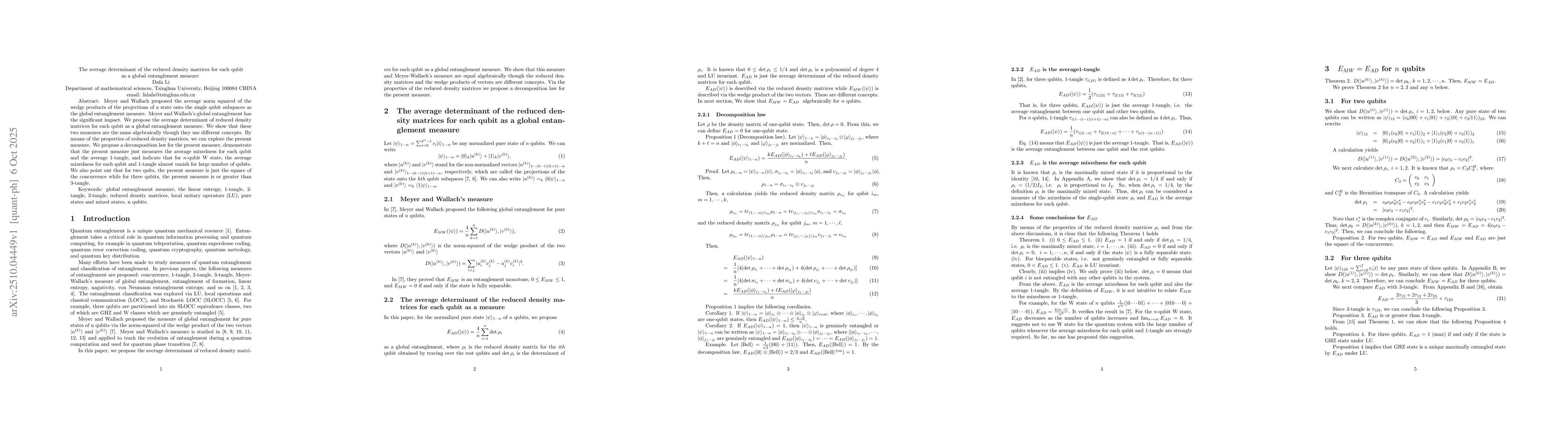 Introducing EAD as a global entanglement measure that directly relates to the average mixedness of qubits and provides a new perspective on entanglement quantification through determinant analysis of reduced density matrices.
