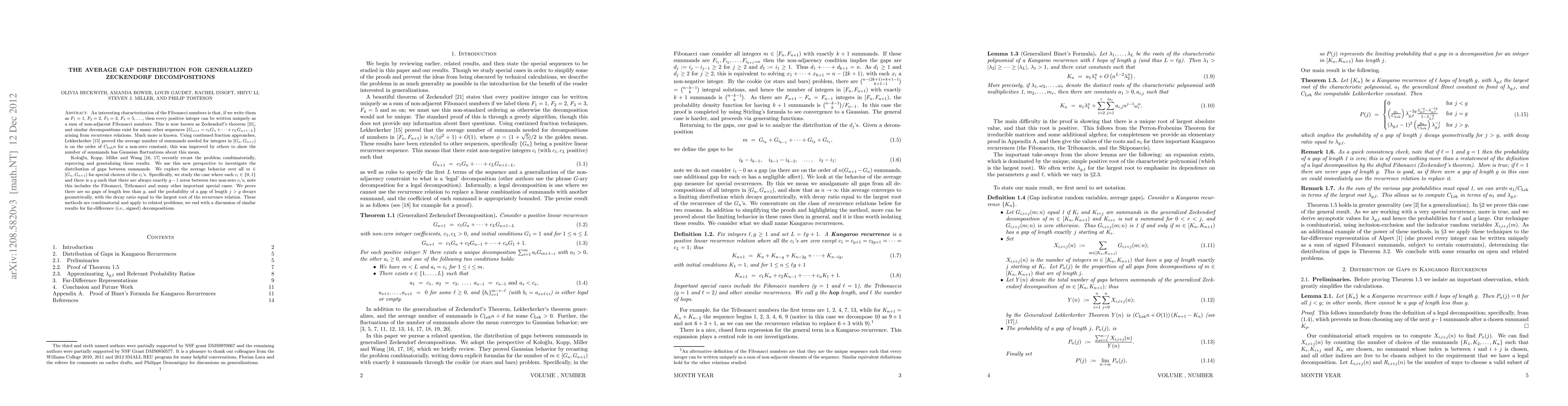 An interesting characterization of the Fibonacci numbers is that, if we write them as $F_1 = 1$, $F_2 = 2$, $F_3 = 3$, $F_4 = 5, ...$, then every positive integer can be written uniquely as a sum of non-adjacent Fibonacci numbers. This is now known as Zeckendorf's theorem [21], and similar decompositions exist for many other sequences ${G_{n+1} = c_1 G_{n} + ... + c_L G_{n+1-L}}$ arising from recurrence relations. Much more is known. Using continued fraction approaches, Lekkerkerker [15] proved the average number of summands needed for integers in $[G_n, G_{n+1})$ is on the order of $C_{{\rm Lek}} n$ for a non-zero constant; this was improved by others to show the number of summands has Gaussian fluctuations about this mean. Kolo$\breve{{\rm g}}$lu, Kopp, Miller and Wang [17, 18] recently recast the problem combinatorially, reproving and generalizing these results. We use this new perspective to investigate the distribution of gaps between summands. We explore the average behavior over all $m \in [G_n, G_{n+1})$ for special choices of the $c_i$'s. Specifically, we study the case where each $c_i \in {0,1}$ and there is a $g$ such that there are always exactly $g-1$ zeros between two non-zero $c_i$'s; note this includes the Fibonacci, Tribonacci and many other important special cases. We prove there are no gaps of length less than $g$, and the probability of a gap of length $j > g$ decays geometrically, with the decay ratio equal to the largest root of the recurrence relation. These methods are combinatorial and apply to related problems; we end with a discussion of similar results for far-difference (i.e., signed) decompositions.