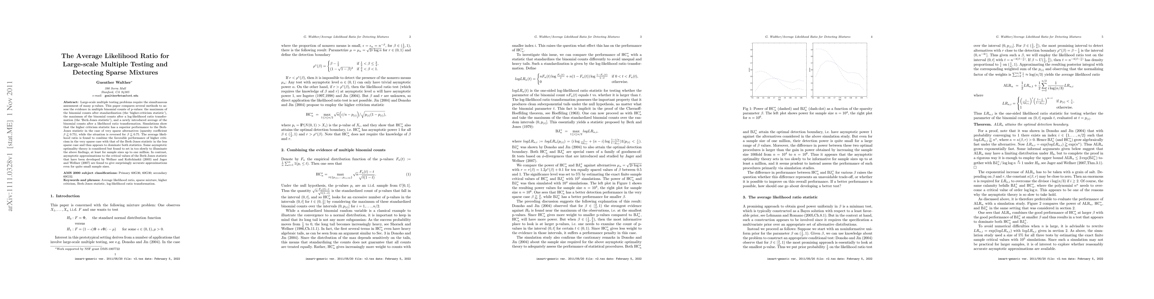 Large-scale multiple testing problems require the simultaneous assessment of many p-values. This paper compares several methods to assess the evidence in multiple binomial counts of p-values: the maximum of the binomial counts after standardization (the `higher-criticism statistic'), the maximum of the binomial counts after a log-likelihood ratio transformation (the `Berk-Jones statistic'), and a newly introduced average of the binomial counts after a likelihood ratio transformation. Simulations show that the higher criticism statistic has a superior performance to the Berk-Jones statistic in the case of very sparse alternatives (sparsity coefficient $\beta \gtrapprox 0.75$), while the situation is reversed for $\beta \lessapprox 0.75$. The average likelihood ratio is found to combine the favorable performance of higher criticism in the very sparse case with that of the Berk-Jones statistic in the less sparse case and thus appears to dominate both statistics. Some asymptotic optimality theory is considered but found to set in too slowly to illuminate the above findings, at least for sample sizes up to one million. In contrast, asymptotic approximations to the critical values of the Berk-Jones statistic that have been developed by Wellner and Koltchinskii (2003) and Jager and Wellner (2007) are found to give surprisingly accurate approximations even for quite small sample sizes.