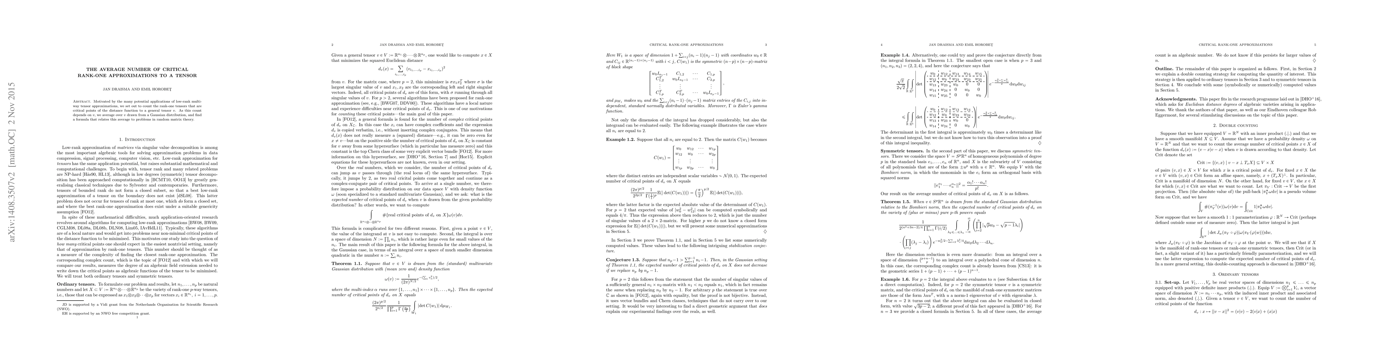 The paper analyzes critical rank-one approximations to a tensor by computing the derivative of the distance function to a general tensor v, averaging over v drawn from a Gaussian distribution, and relating this average to problems in random matrix theory.