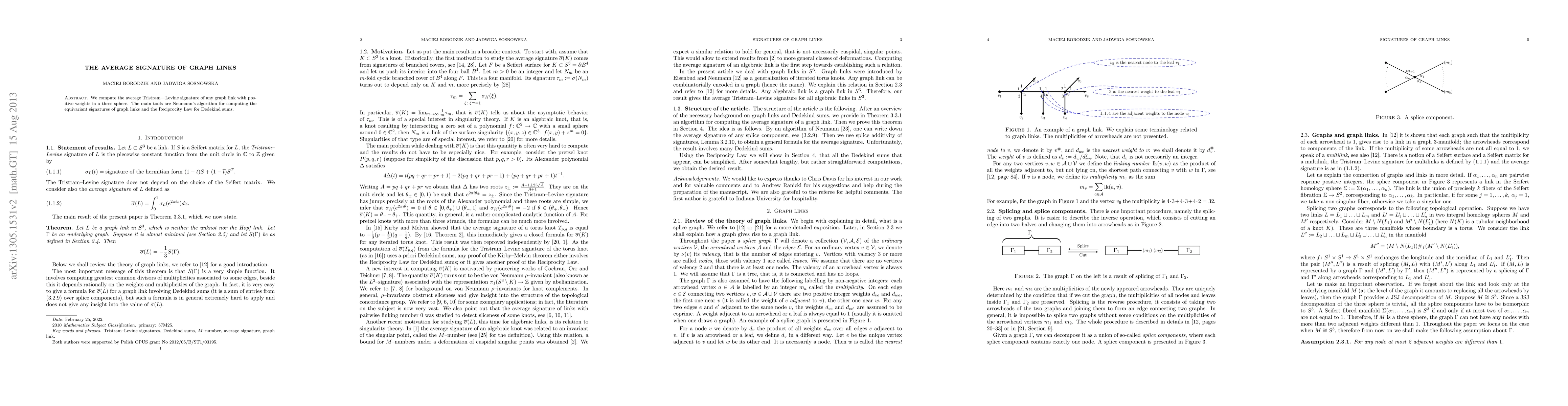 Researchers calculated the average signature of graph links with positive weights in three-dimensional spaces, generalizing previous results. This computation involves Neumann's algorithm and the Reciprocity Law for Dedekind sums.