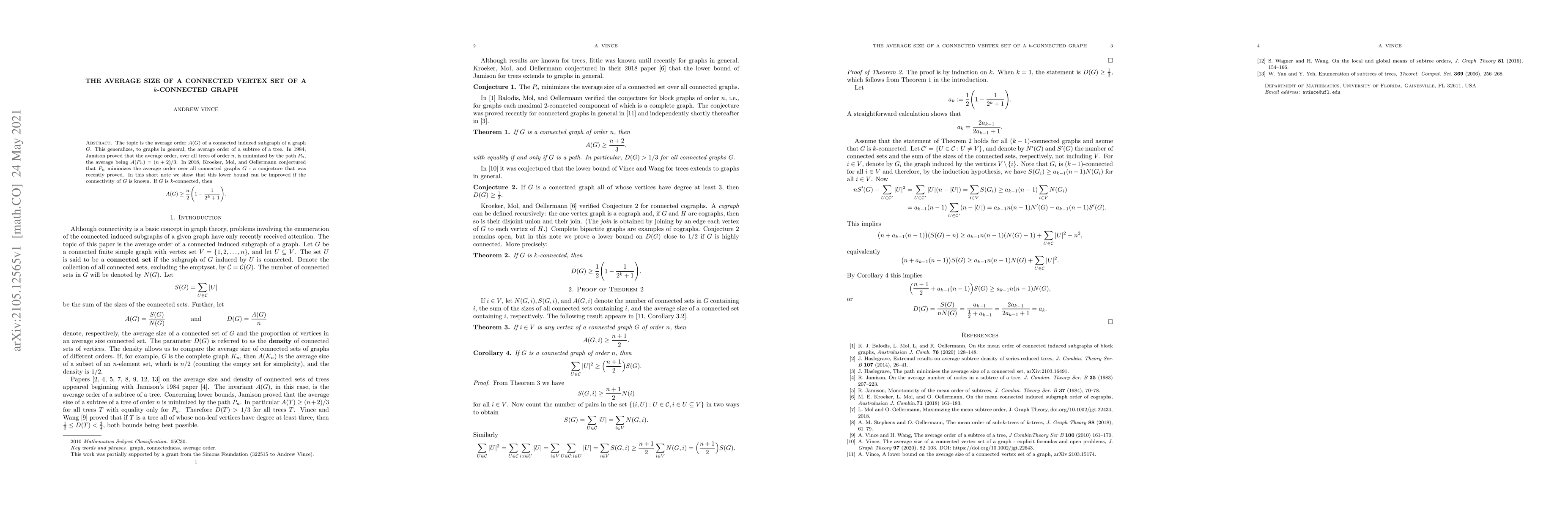 Researchers show that in k-connected graphs, the average size of a connected vertex set is at least (n/2)(1 - 1/(2^k+1)). This improvement over the previously known lower bound demonstrates a significant advancement in understanding graph connectivity and subgraph properties.