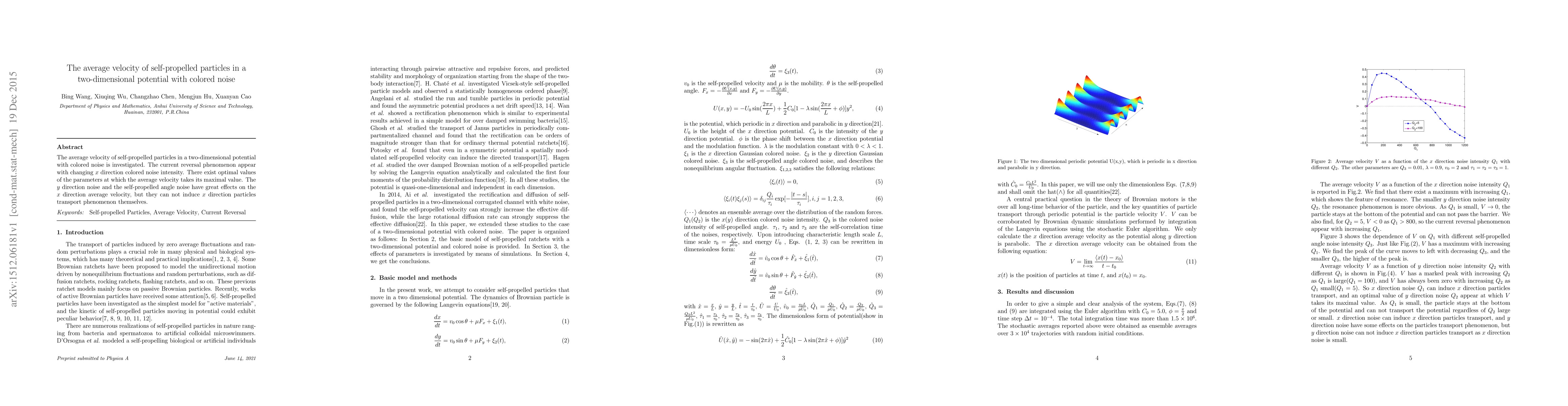 This study investigates the average velocity of self-propelled particles in a two-dimensional potential under colored noise, revealing a current reversal phenomenon with varying x direction noise intensity. Optimal parameter values maximize average velocity, while y direction and self-propelled angle noise significantly affect x direction velocity but do not induce directional transport on their own.