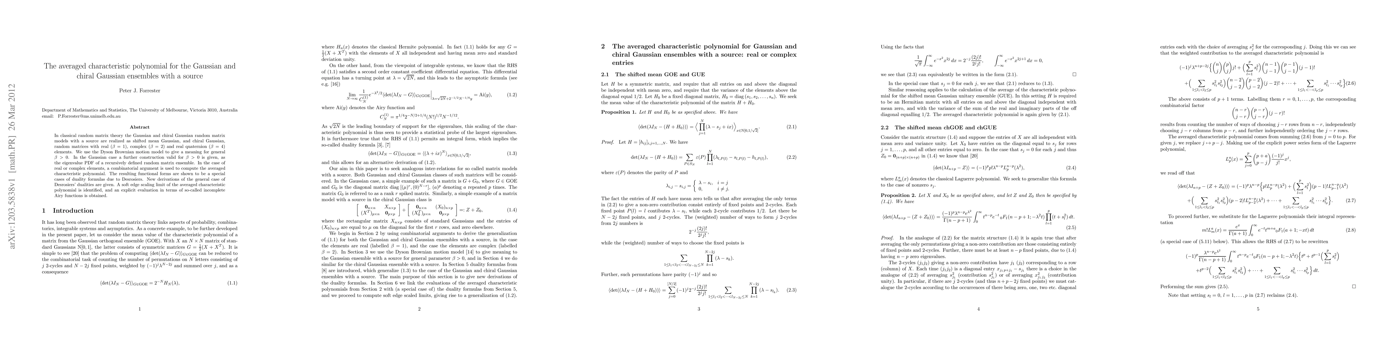 In classical random matrix theory the Gaussian and chiral Gaussian random matrix models with a source are realized as shifted mean Gaussian, and chiral Gaussian, random matrices with real $(\beta = 1)$, complex ($\beta = 2)$ and real quaternion $(\beta = 4$) elements. We use the Dyson Brownian motion model to give a meaning for general $\beta > 0$. In the Gaussian case a further construction valid for $\beta > 0$ is given, as the eigenvalue PDF of a recursively defined random matrix ensemble. In the case of real or complex elements, a combinatorial argument is used to compute the averaged characteristic polynomial. The resulting functional forms are shown to be a special cases of duality formulas due to Desrosiers. New derivations of the general case of Desrosiers' dualities are given. A soft edge scaling limit of the averaged characteristic polynomial is identified, and an explicit evaluation in terms of so-called incomplete Airy functions is obtained.