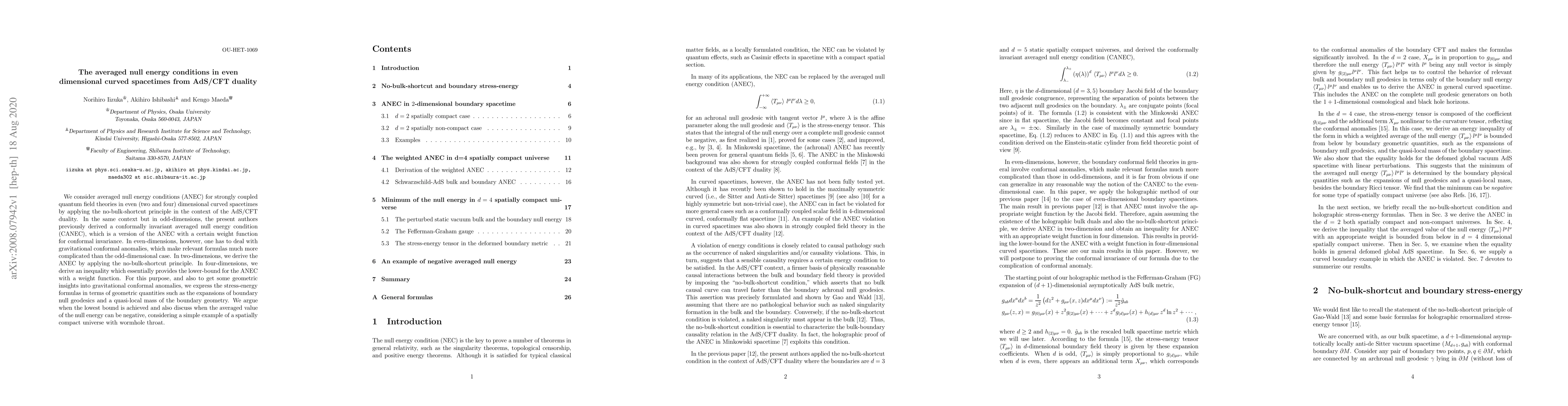 This paper explores the averaged null energy conditions (ANEC) in even-dimensional curved spacetimes using AdS/CFT duality, deriving ANEC in two and four dimensions. It addresses gravitational conformal anomalies complicating the even-dimensional case and provides insights into geometric quantities like boundary null geodesic expansions and quasi-local mass.
