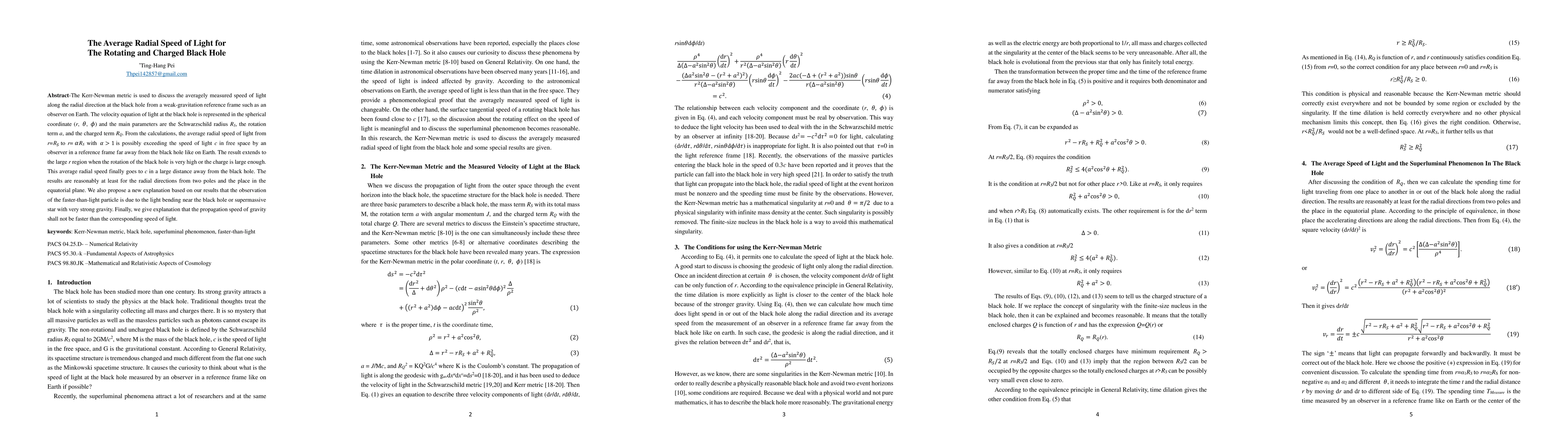 This paper explores the average radial speed of light near a rotating and charged black hole using the Kerr-Newman metric. It finds that, from a distant observer's view, light's radial speed may surpass the speed of light (c) in certain regions due to extreme rotation or charge. The study also proposes that observations of faster-than-light particles could result from light bending around supermassive objects, and affirms that gravity's propagation speed cannot exceed that of light.