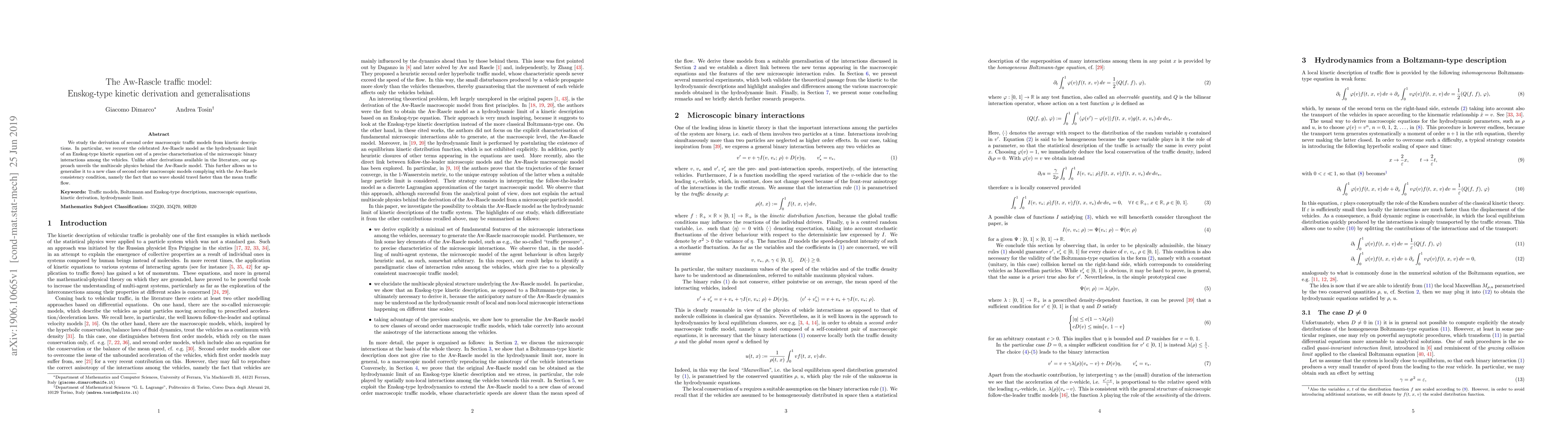 The paper derives the Aw-Rascle traffic model from an Enskog-type kinetic equation, revealing the underlying multiscale physics. It also generalises the model to new second-order macroscopic traffic models that maintain the Aw-Rascle consistency condition.