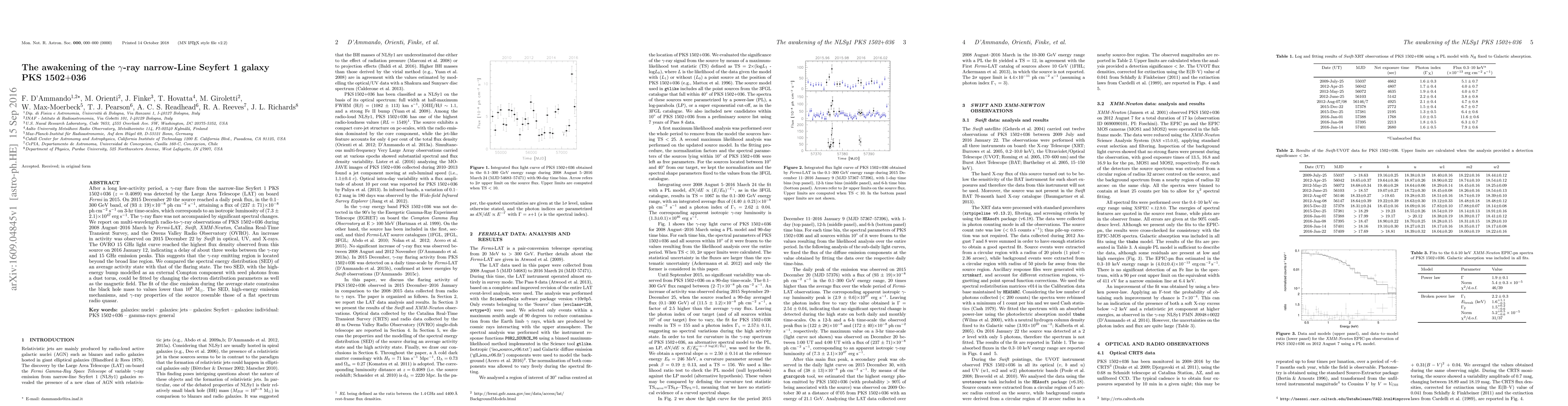 After a long low-activity period, a gamma-ray flare from the narrow-line Seyfert 1 PKS 1502+036 (z=0.4089) was detected by the Large Area Telescope (LAT) on board Fermi in 2015. On 2015 December 20 the source reached a daily peak flux, in the 0.1-300 GeV band, of (93 $\pm$ 19) $\times$10$^{-8}$ ph cm$^{-2}$ s$^{-1}$, attaining a flux of (237 $\pm$ 71) $\times$10$^{-8}$ ph cm$^{-2}$ s$^{-1}$ on 3-hr time-scales, which corresponds to an isotropic luminosity of (7.3 $\pm$ 2.1) $\times$10$^{47}$ erg/s. The gamma-ray flare was not accompanied by significant spectral changes. We report on multi-wavelength radio-to-gamma-ray observations of PKS 1502+036 during 2008 August-2016 March by Fermi-LAT, Swift, XMM-Newton, Catalina Real-Time Transient Survey, and the Owens Valley Radio Observatory (OVRO). An increase in activity was observed on 2015 December 22 by Swift in optical, UV, and X-rays. The OVRO 15 GHz light curve reached the highest flux density observed from this source on 2016 January 12, indicating a delay of about three weeks between the gamma-ray and 15 GHz emission peaks. This suggests that the gamma-ray emitting region is located beyond the broad line region. We compared the spectral energy distribution (SED) of an average activity state with that of the flaring state. The two SED, with the high-energy bump modelled as an external Compton component with seed photons from a dust torus, could be fitted by changing the electron distribution parameters as well as the magnetic field. The fit of the disc emission during the average state constrains the black hole mass to values lower than 10$^8$ solar masses. The SED, high-energy emission mechanisms, and gamma-ray properties of the source resemble those of a flat spectrum radio quasar.
