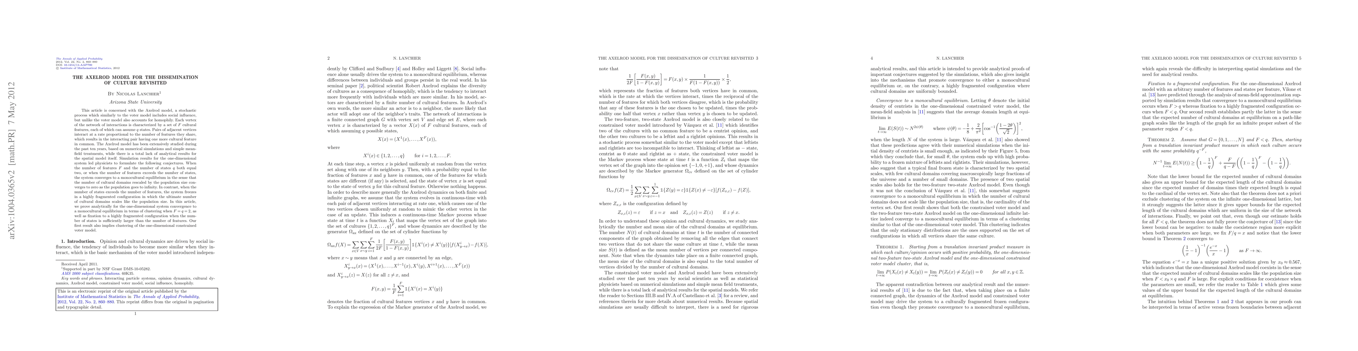 This paper analytically proves the convergence to a monocultural equilibrium in the Axelrod model for $F=q=2$ and demonstrates fixation to a fragmented configuration when the number of states exceeds the number of features, addressing long-standing conjectures based on numerical simulations.