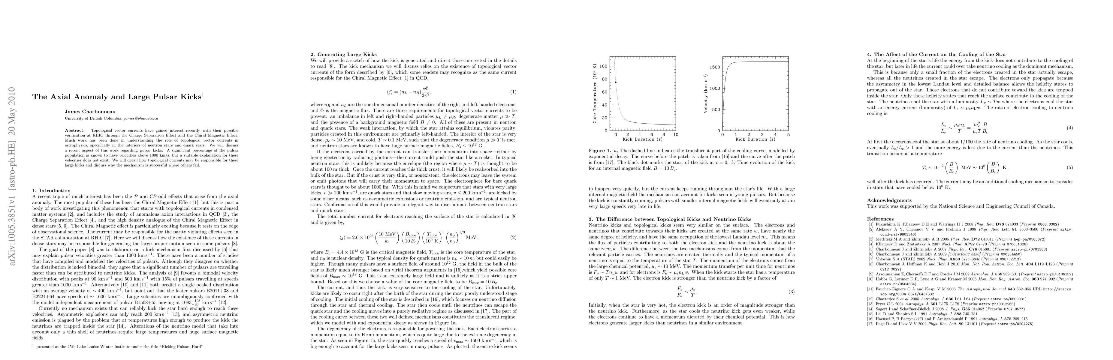 This paper explores the role of topological vector currents in explaining the high velocities of pulsars, known as large pulsar kicks. It proposes that these currents, potentially verified through effects like the Charge Separation Effect, could be the mechanism behind the observed high speeds, offering a plausible explanation where other theories fall short.