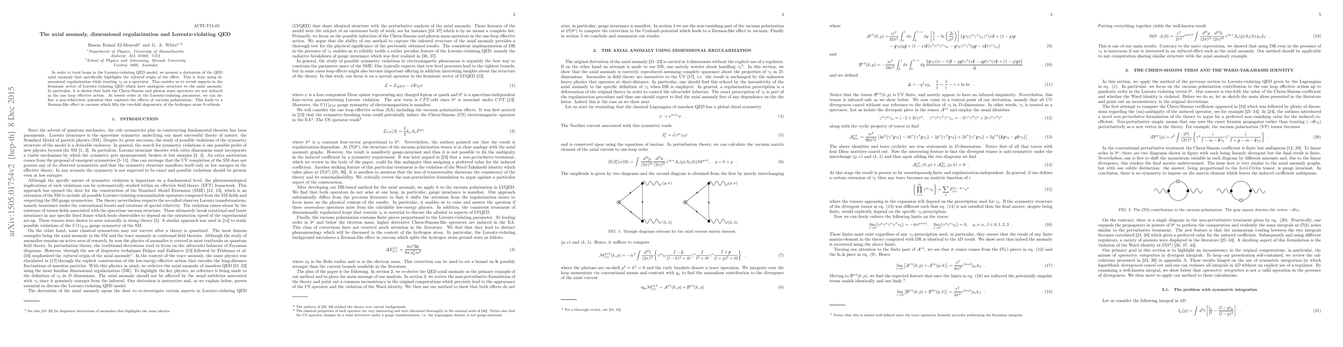 In order to treat loops in the Lorentz-violating QED model, we present a derivation of the QED axial anomaly that specifically highlights the infrared origin of the effect. This is done using dimensional regularization while treating $\gamma_5$ as a spectator. This enables us to revisit aspects in the fermionic sector of Lorentz-violating QED which have analogous structure to the axial anomaly. In particular, it is shown that both the Chern-Simons and photon mass operators are not induced in the one loop effective action. At lowest order in the Lorentz-violating parameter, we can define a non-relativistic potential that captures the effects of vacuum polarization. This leads to a Zeeman-like effect in vacuum which lifts the two-fold degeneracy of the hydrogen atom S-orbitals.
