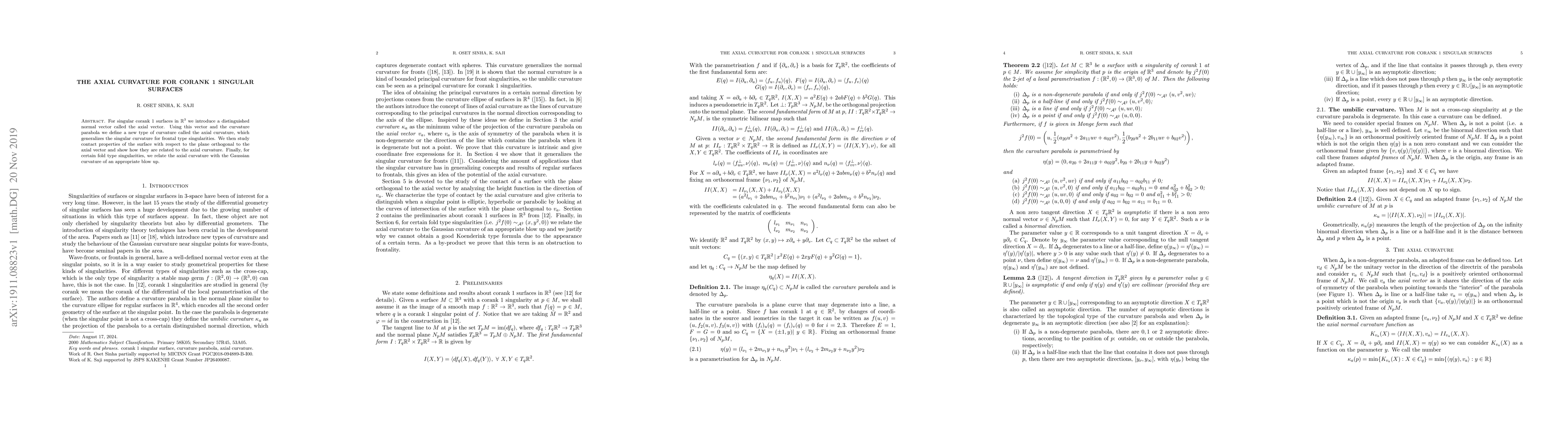 This paper introduces the axial curvature for singular corank 1 surfaces in $\mathbb R^3$ using a distinguished axial vector, generalizing singular curvature for frontal singularities. It examines the relationship between the axial curvature and the surface's contact properties with planes orthogonal to the axial vector, and links axial curvature to Gaussian curvature for specific fold singularities.