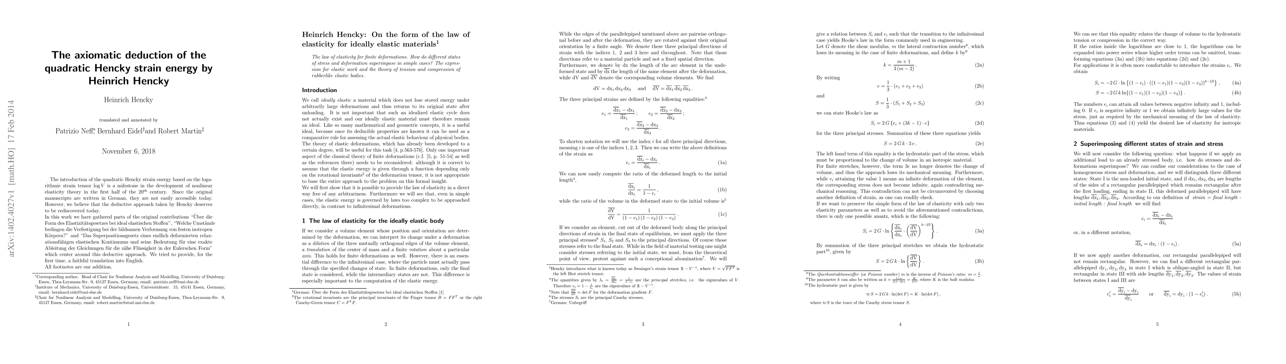 This paper presents a translation and analysis of Heinrich Hencky's original works on the quadratic Hencky strain energy, a significant contribution to the theory of nonlinear elasticity. The author aims to make Hencky's deductive approach accessible to a broader audience by providing an English translation of key manuscripts.